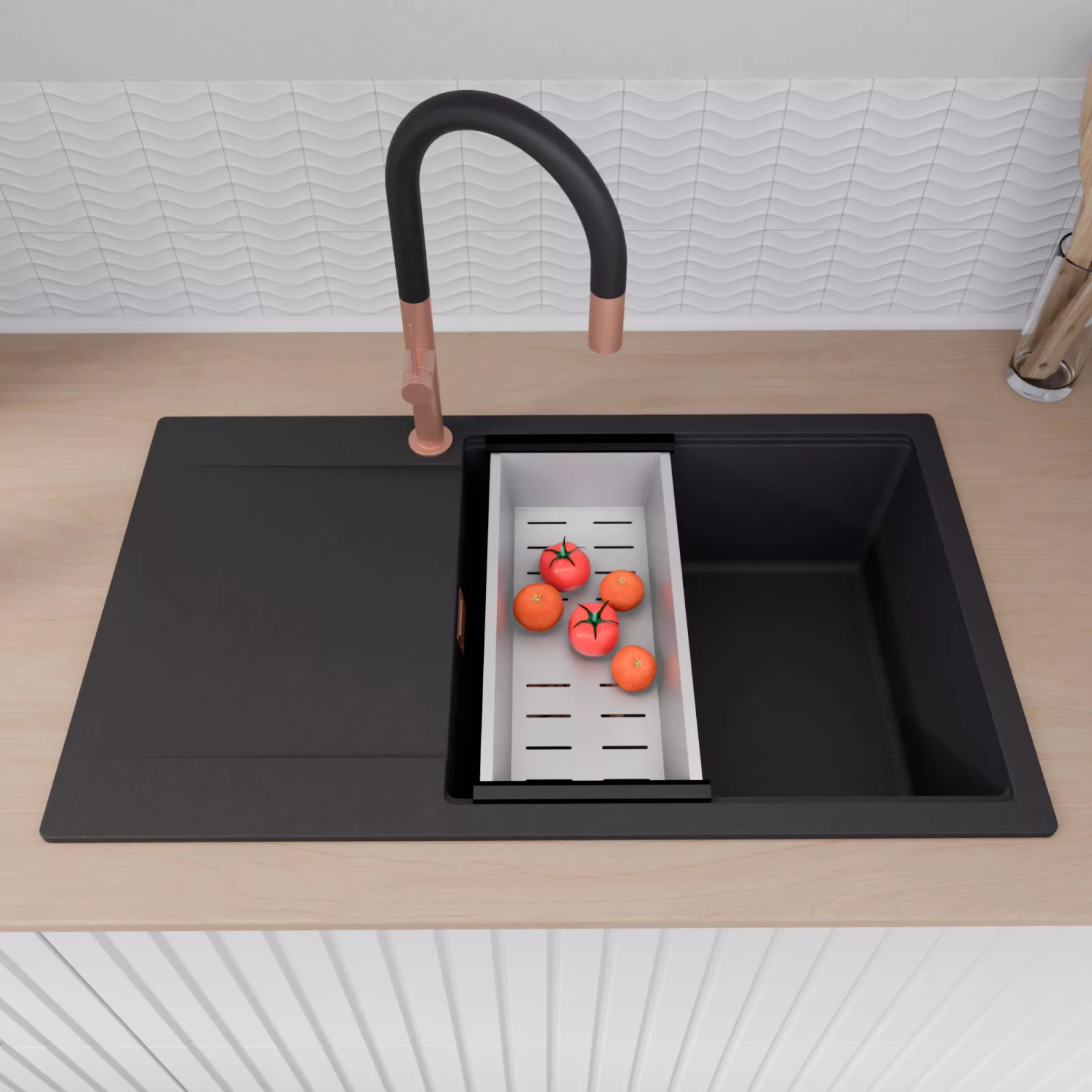 A mosogató prémium minőségű gránit kompozitból készült. Letisztult megjelenése mellett rendkívül praktikus, így bármilyen stílusú konyhába harmonikusan illeszkedik. A strapabíró gránit anyag hosszú távon is megbízható használatot garantál.