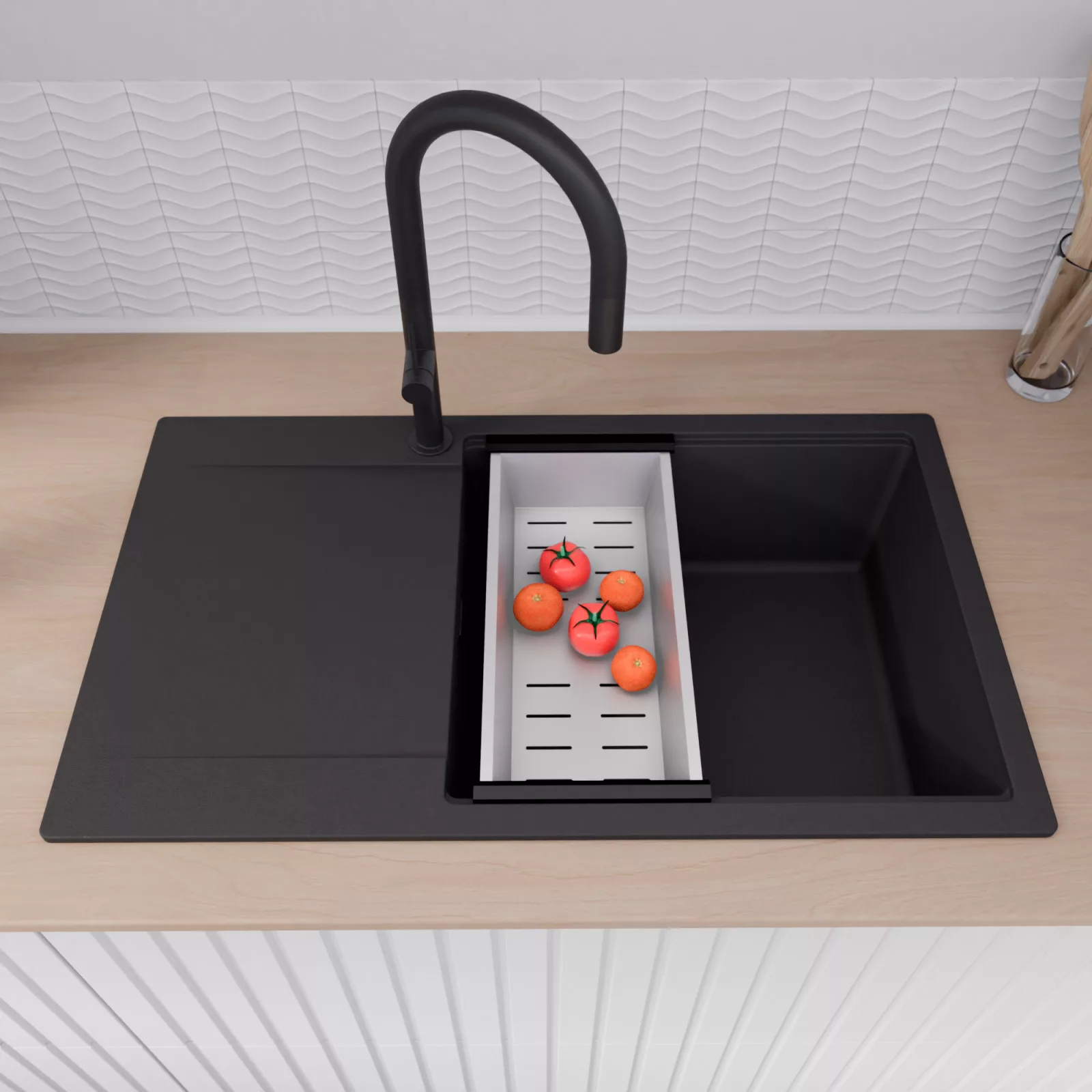 A mosogató prémium minőségű gránit kompozitból készült. Letisztult megjelenése mellett rendkívül praktikus, így bármilyen stílusú konyhába harmonikusan illeszkedik. A strapabíró gránit anyag hosszú távon is megbízható használatot garantál.