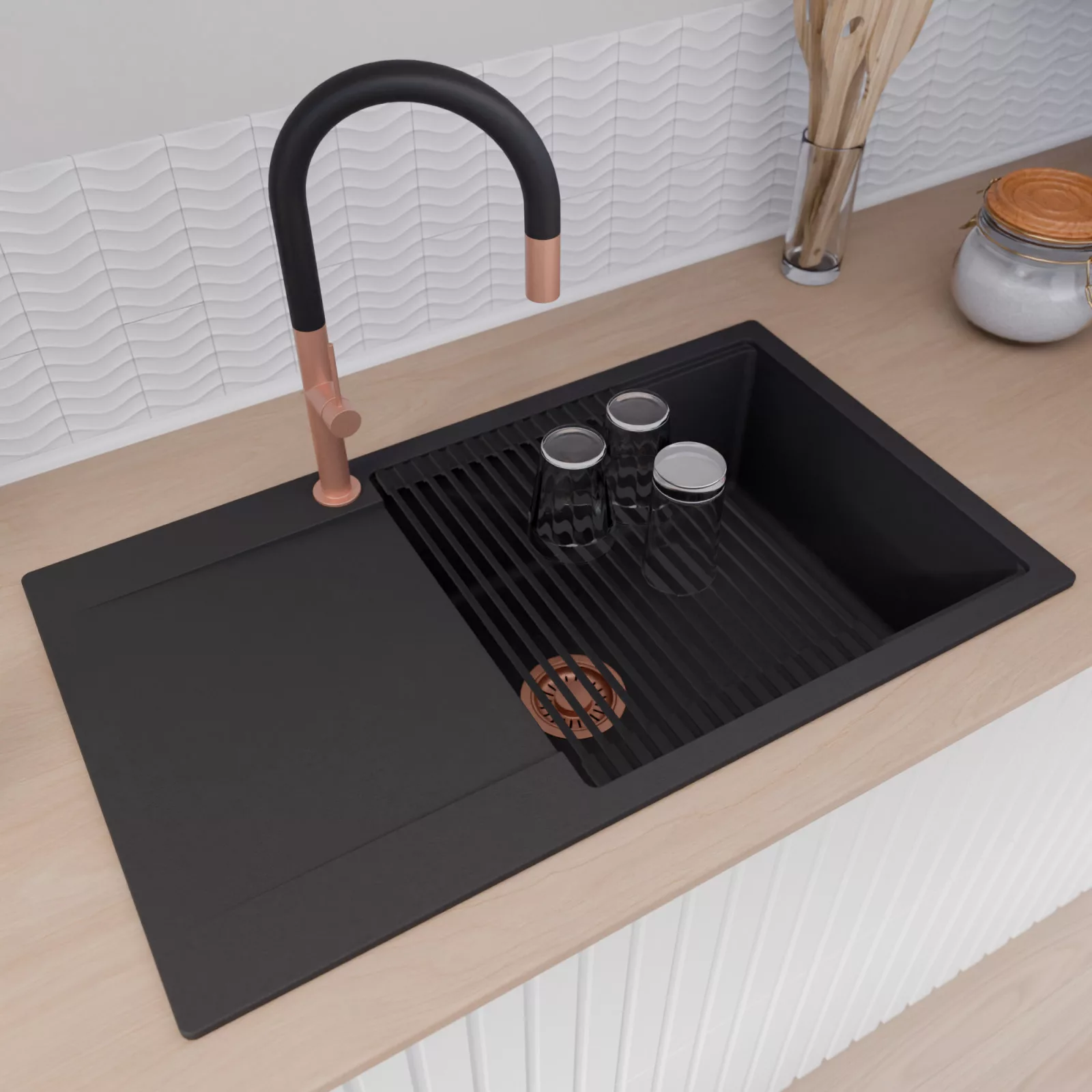 A mosogató prémium minőségű gránit kompozitból készült. Letisztult megjelenése mellett rendkívül praktikus, így bármilyen stílusú konyhába harmonikusan illeszkedik. A strapabíró gránit anyag hosszú távon is megbízható használatot garantál.
