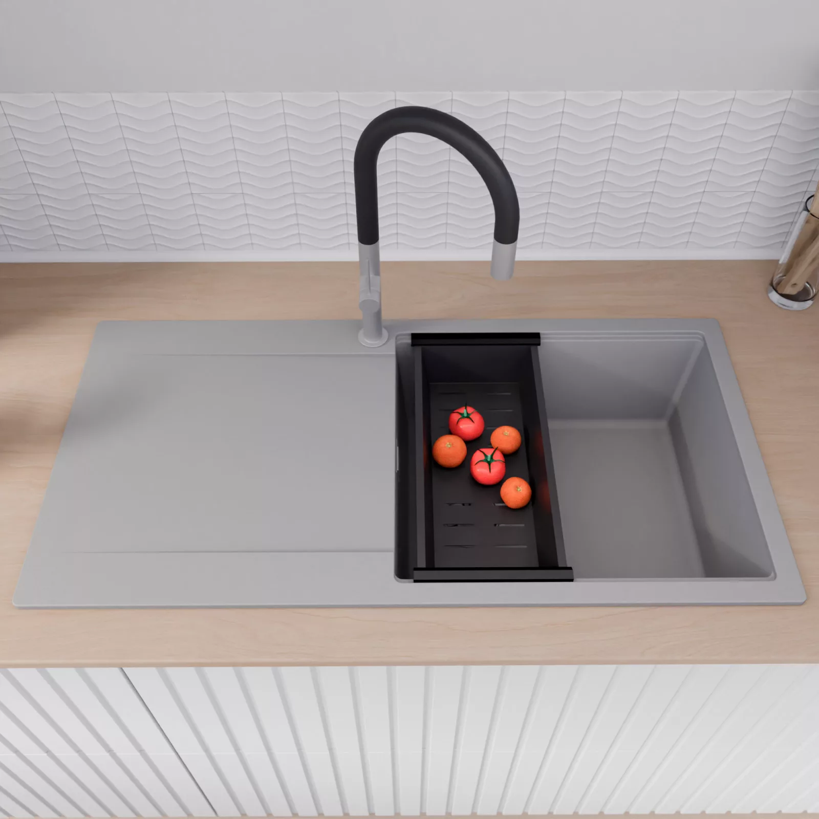 A mosogató prémium minőségű gránit kompozitból készült. Letisztult megjelenése mellett rendkívül praktikus, így bármilyen stílusú konyhába harmonikusan illeszkedik. A strapabíró gránit anyag hosszú távon is megbízható használatot garantál.