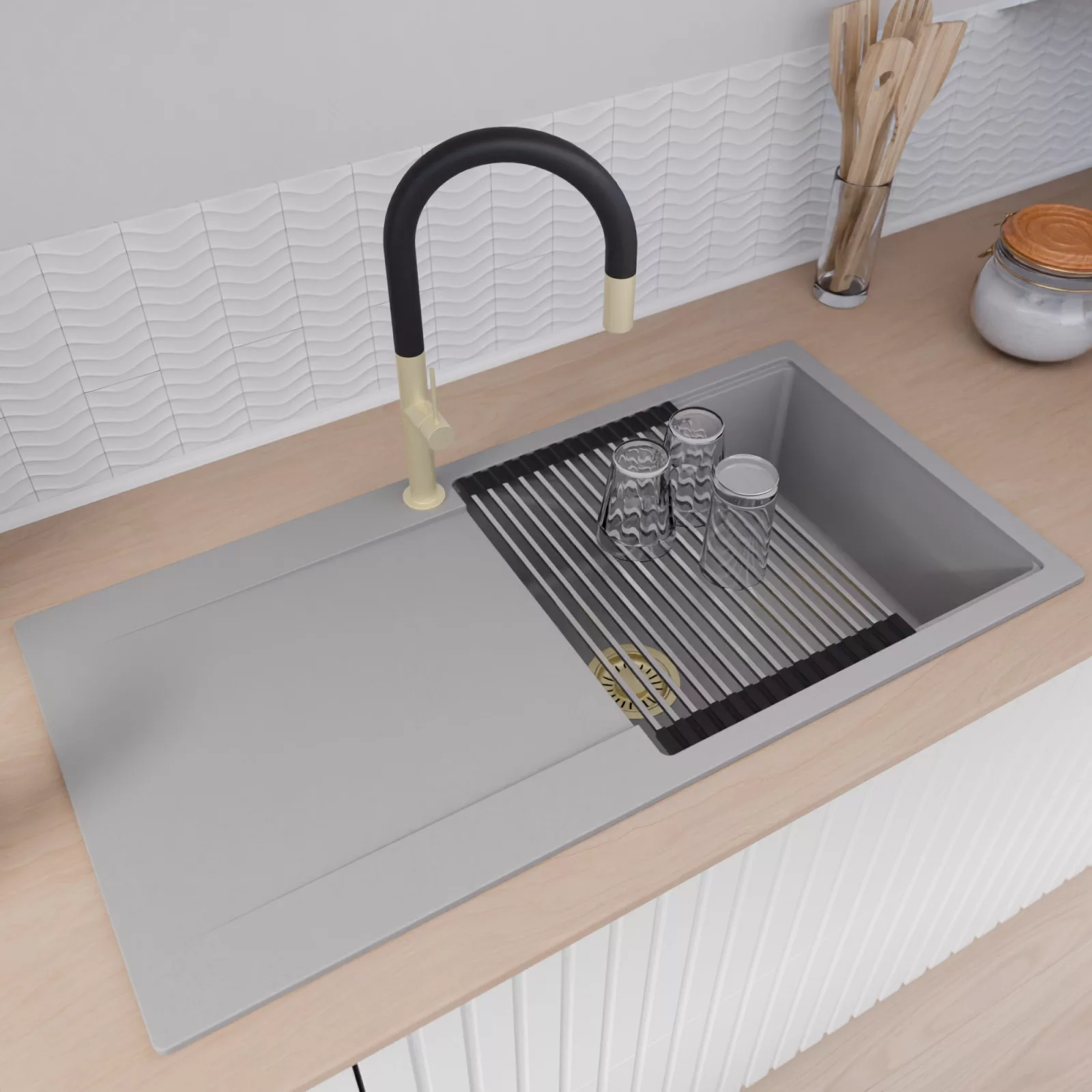 A mosogató prémium minőségű gránit kompozitból készült. Letisztult megjelenése mellett rendkívül praktikus, így bármilyen stílusú konyhába harmonikusan illeszkedik. A strapabíró gránit anyag hosszú távon is megbízható használatot garantál.