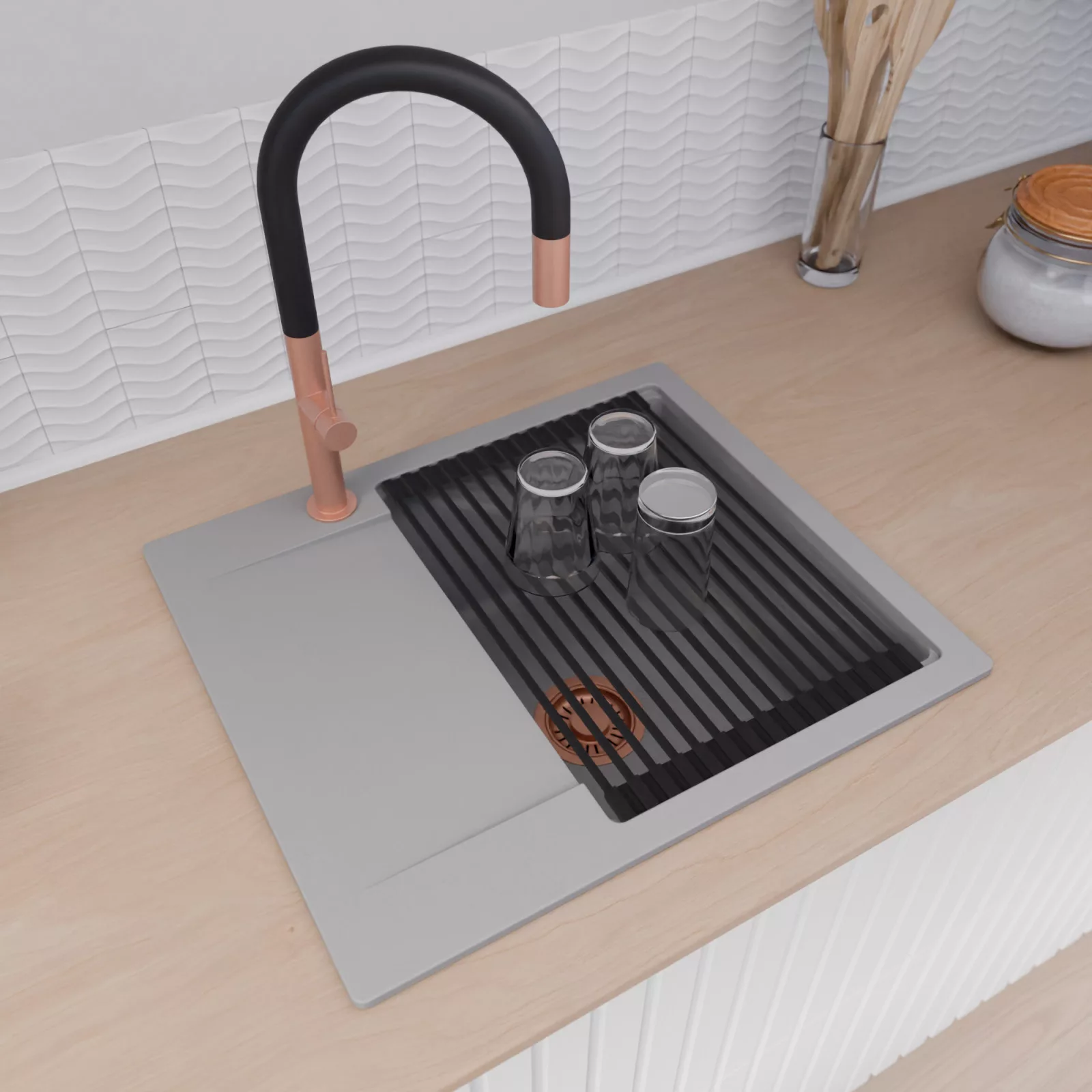 A mosogató prémium minőségű gránit kompozitból készült. Letisztult megjelenése mellett rendkívül praktikus, így bármilyen stílusú konyhába harmonikusan illeszkedik. A strapabíró gránit anyag hosszú távon is megbízható használatot garantál.