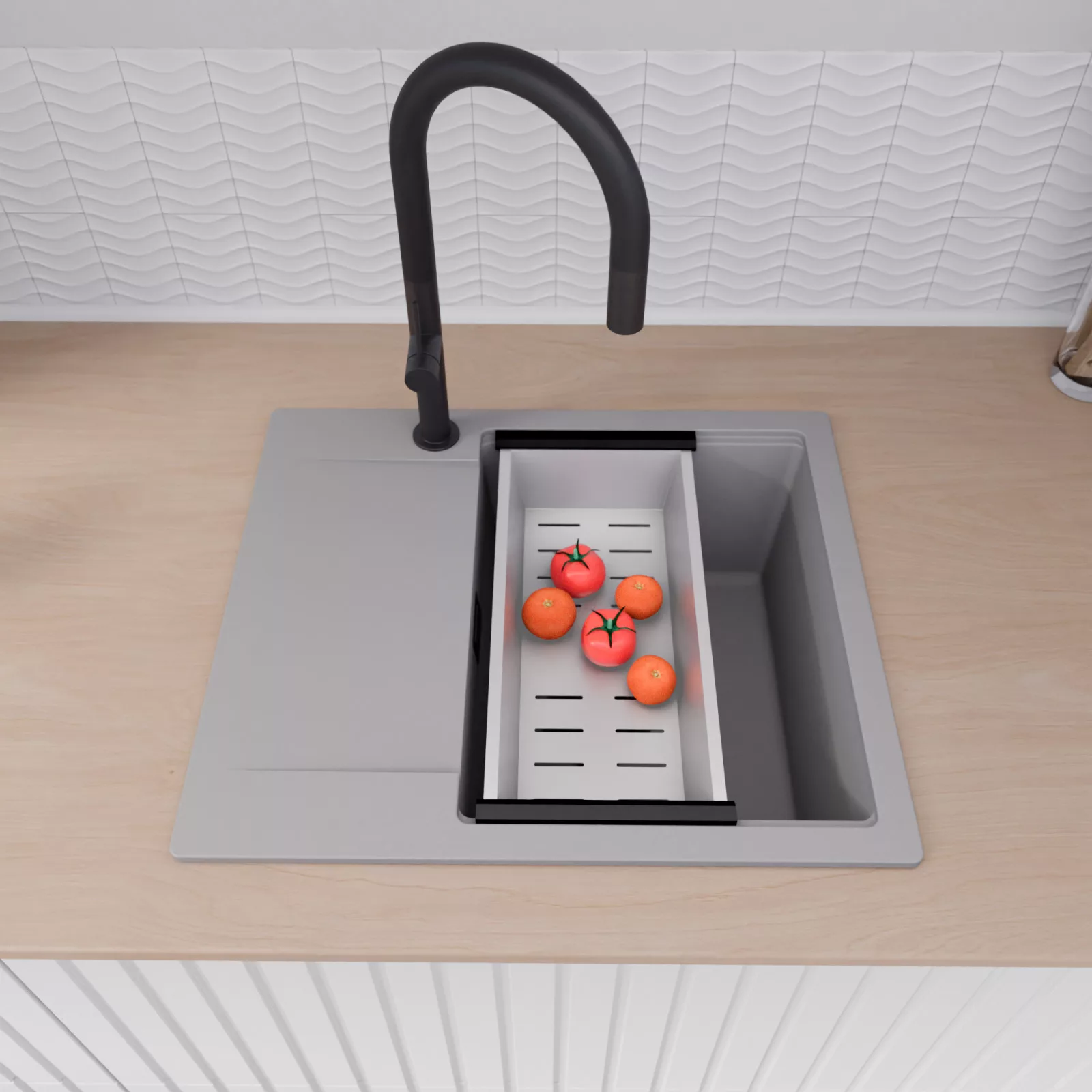 A mosogató prémium minőségű gránit kompozitból készült. Letisztult megjelenése mellett rendkívül praktikus, így bármilyen stílusú konyhába harmonikusan illeszkedik. A strapabíró gránit anyag hosszú távon is megbízható használatot garantál.