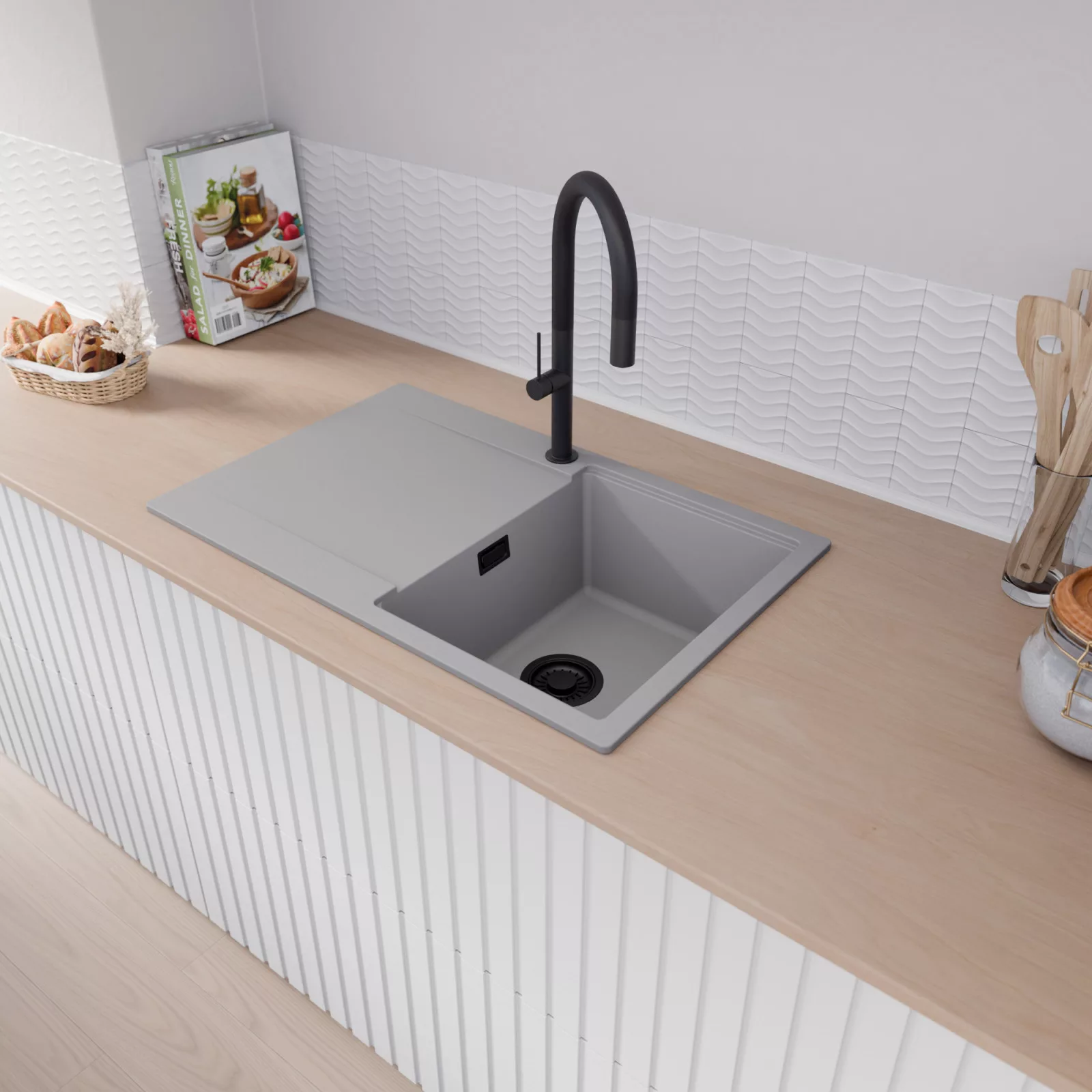 A mosogató prémium minőségű gránit kompozitból készült, amely kiváló ellenállást biztosít a mindennapi használat során keletkező karcolásokkal szemben. A strapabíró gránit felület hosszú távon is megőrzi esztétikus megjelenését, így a mosogató intenzív igénybevétel mellett is megmarad újszerű állapotában.