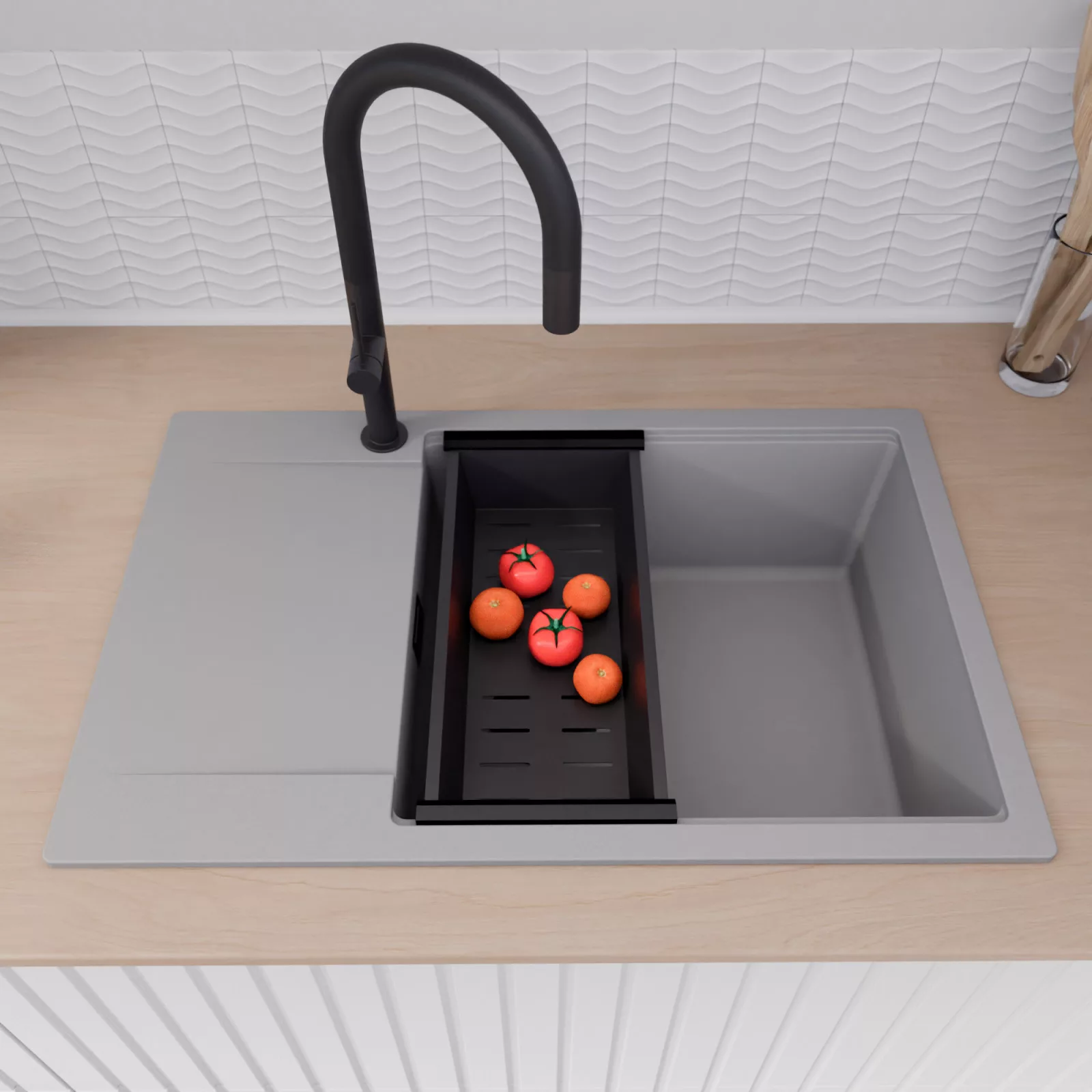 A mosogató prémium minőségű gránit kompozitból készült. Letisztult megjelenése mellett rendkívül praktikus, így bármilyen stílusú konyhába harmonikusan illeszkedik. A strapabíró gránit anyag hosszú távon is megbízható használatot garantál.