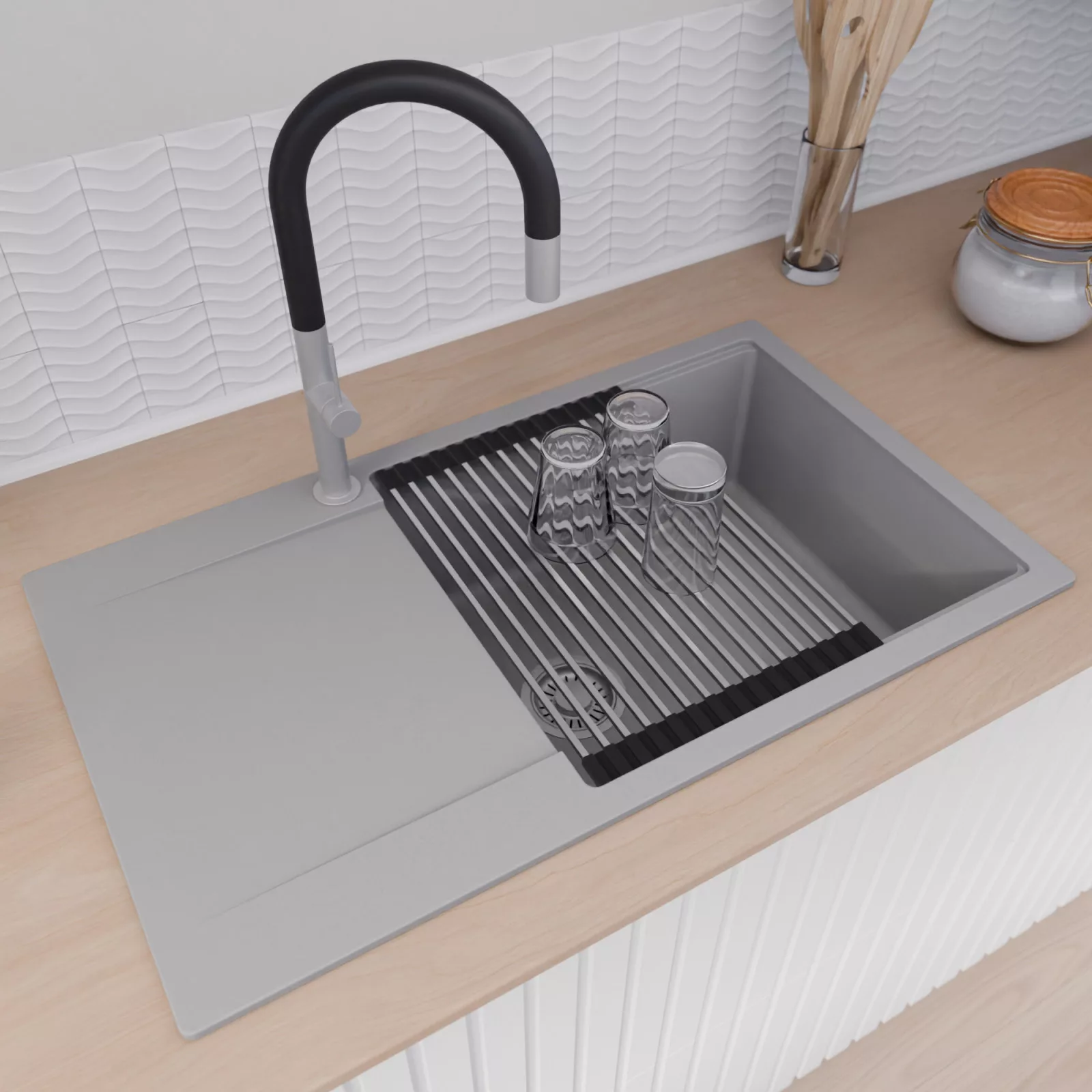 A mosogató prémium minőségű gránit kompozitból készült. Letisztult megjelenése mellett rendkívül praktikus, így bármilyen stílusú konyhába harmonikusan illeszkedik. A strapabíró gránit anyag hosszú távon is megbízható használatot garantál.