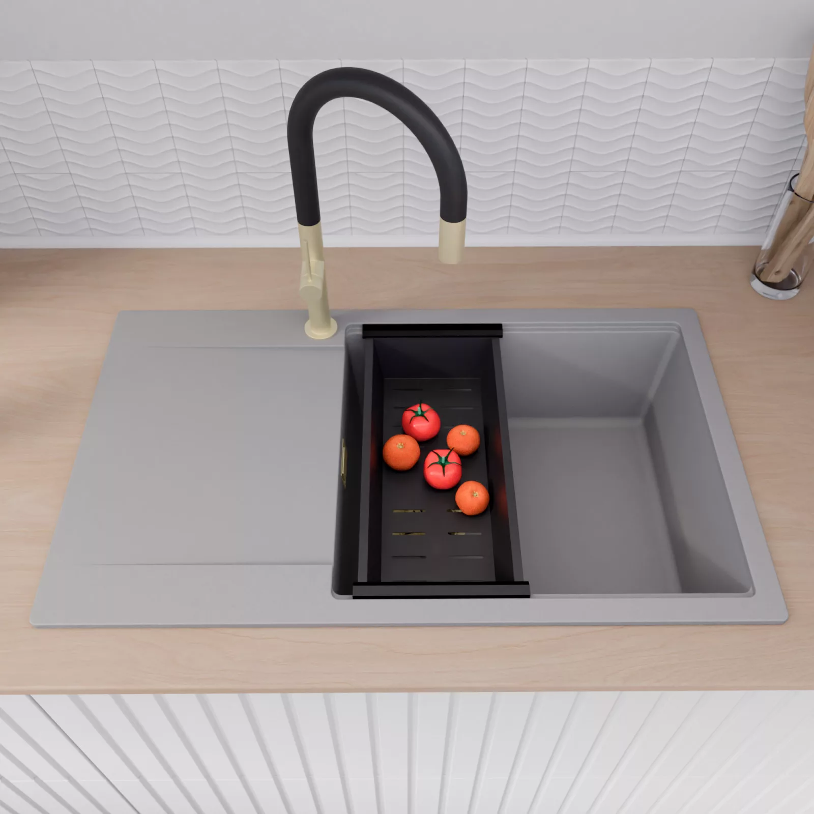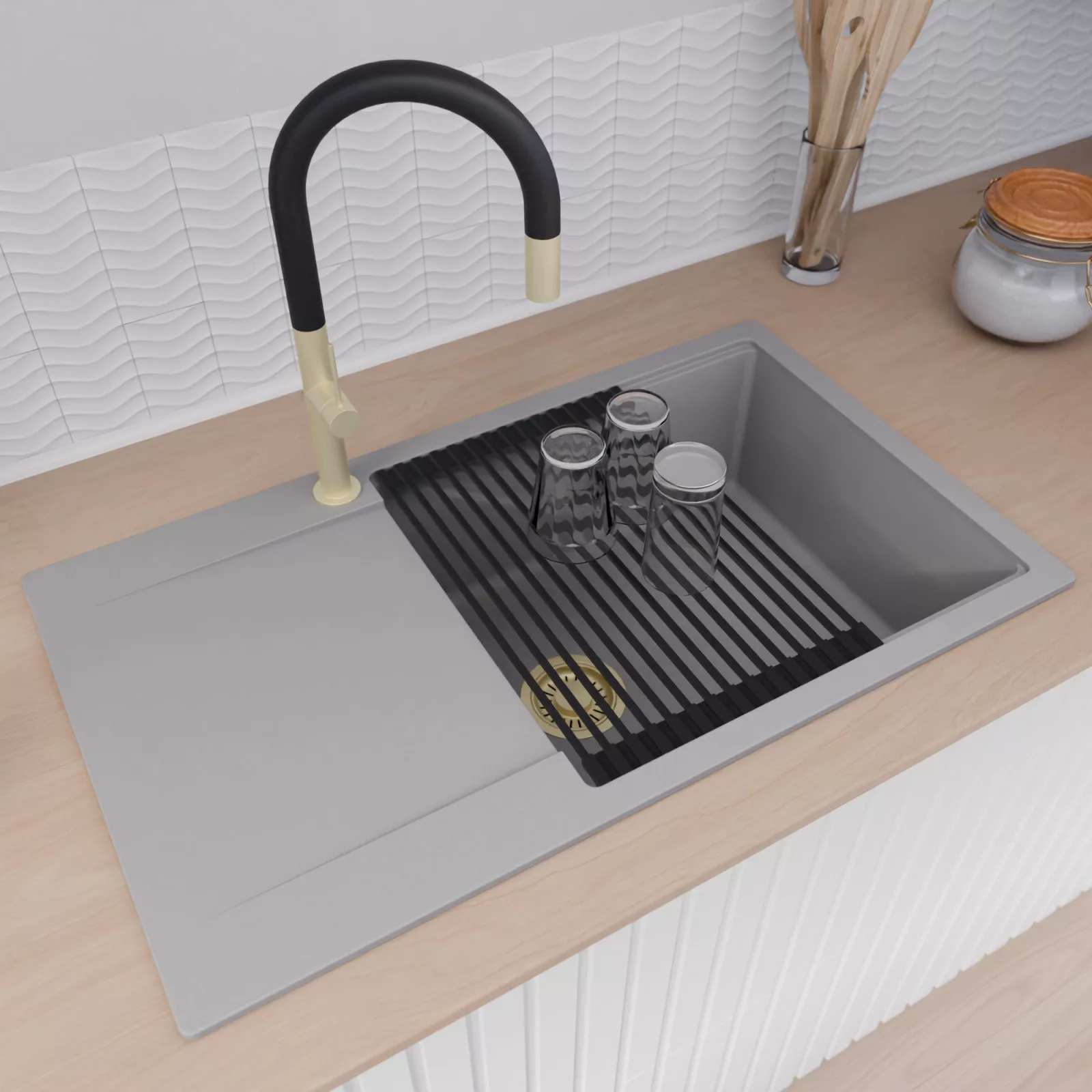 A mosogató prémium minőségű gránit kompozitból készült. Letisztult megjelenése mellett rendkívül praktikus, így bármilyen stílusú konyhába harmonikusan illeszkedik. A strapabíró gránit anyag hosszú távon is megbízható használatot garantál.