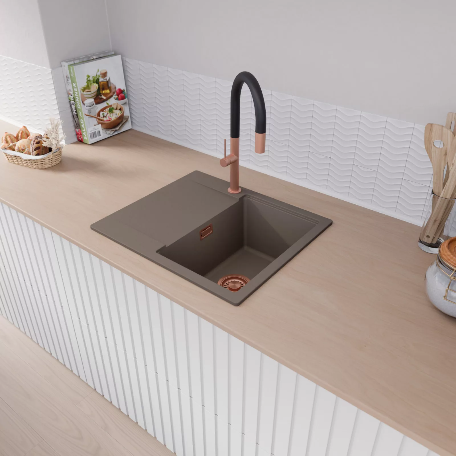 A mosogató prémium minőségű gránit kompozitból készült, amely kiváló ellenállást biztosít a mindennapi használat során keletkező karcolásokkal szemben. A strapabíró gránit felület hosszú távon is megőrzi esztétikus megjelenését, így a mosogató intenzív igénybevétel mellett is megmarad újszerű állapotában.