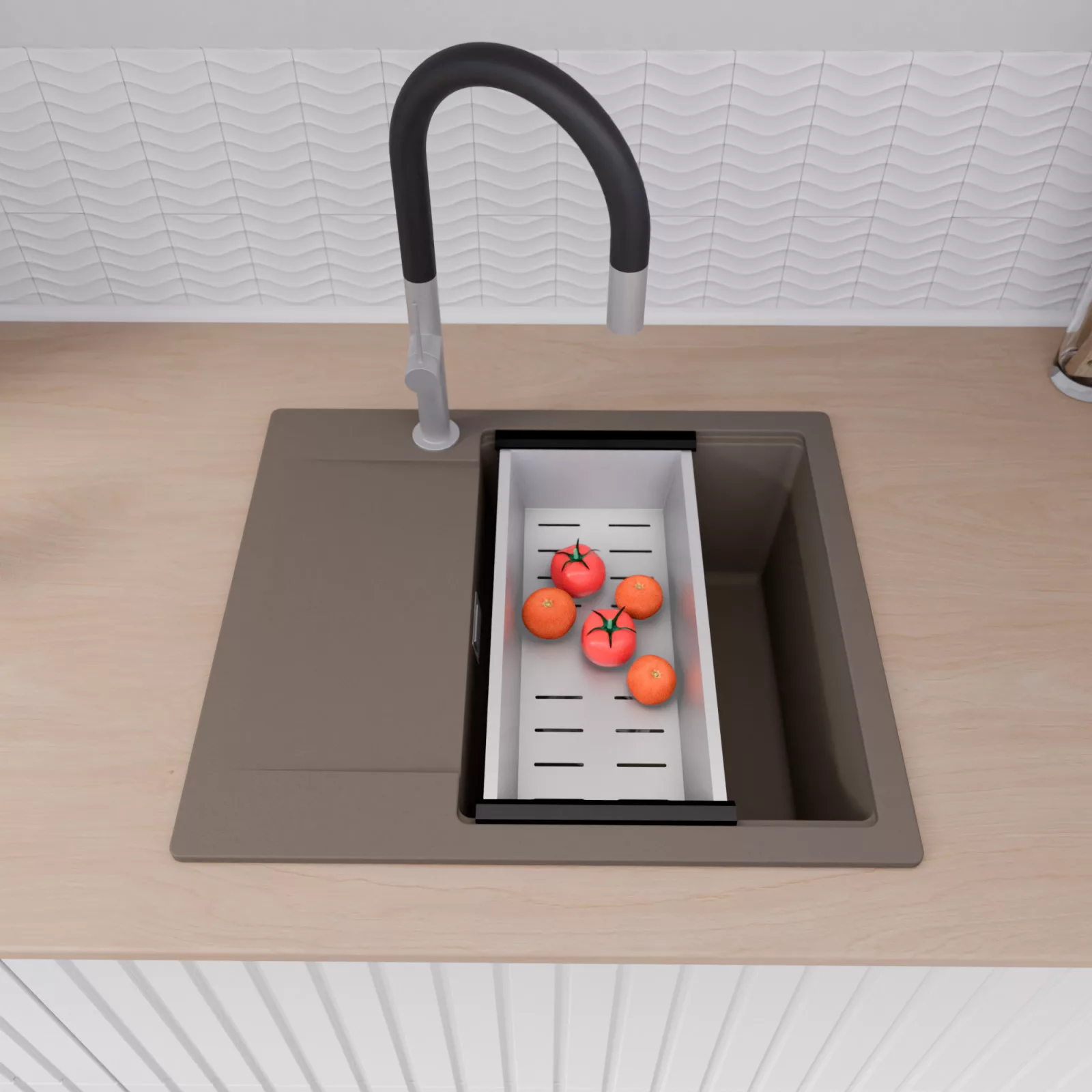 HD Onyx Tortora 58 egymedencés mosogatótálca szett, csepegtetőráccsal és kosárral, tortora