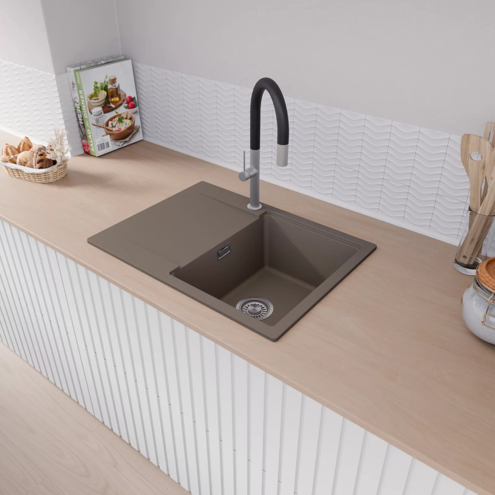 A mosogató prémium minőségű gránit kompozitból készült, amely kiváló ellenállást biztosít a mindennapi használat során keletkező karcolásokkal szemben. A strapabíró gránit felület hosszú távon is megőrzi esztétikus megjelenését, így a mosogató intenzív igénybevétel mellett is megmarad újszerű állapotában.