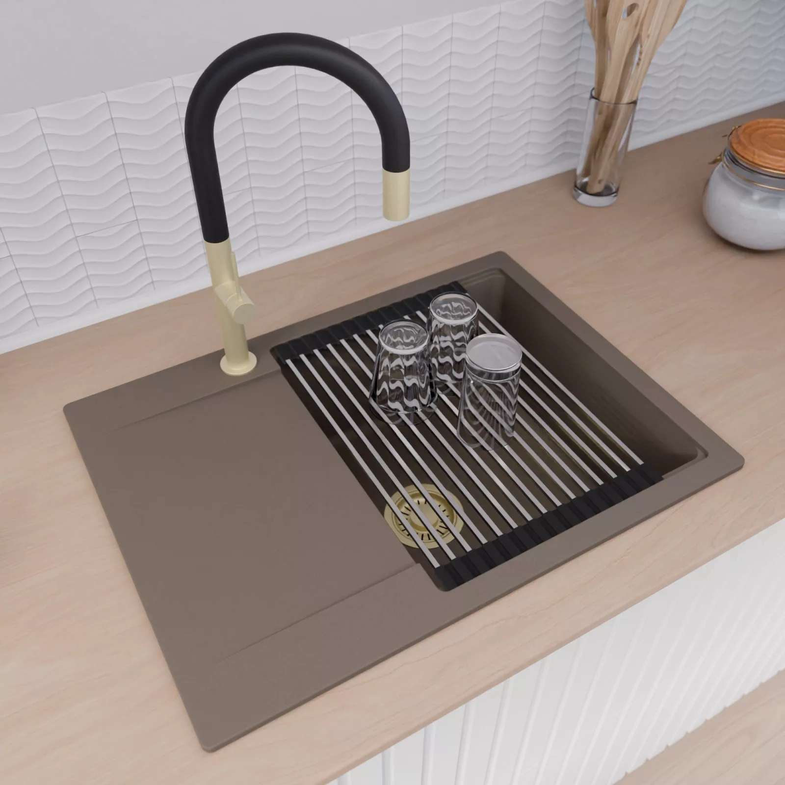 HD Onyx Tortora 68-XL egymedencés mosogatótálca szett, csepegtetőráccsal, tortora