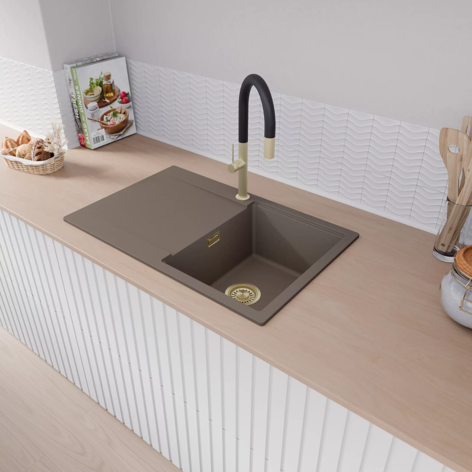 A mosogató prémium minőségű gránit kompozitból készült, amely kiváló ellenállást biztosít a mindennapi használat során keletkező karcolásokkal szemben. A strapabíró gránit felület hosszú távon is megőrzi esztétikus megjelenését, így a mosogató intenzív igénybevétel mellett is megmarad újszerű állapotában.