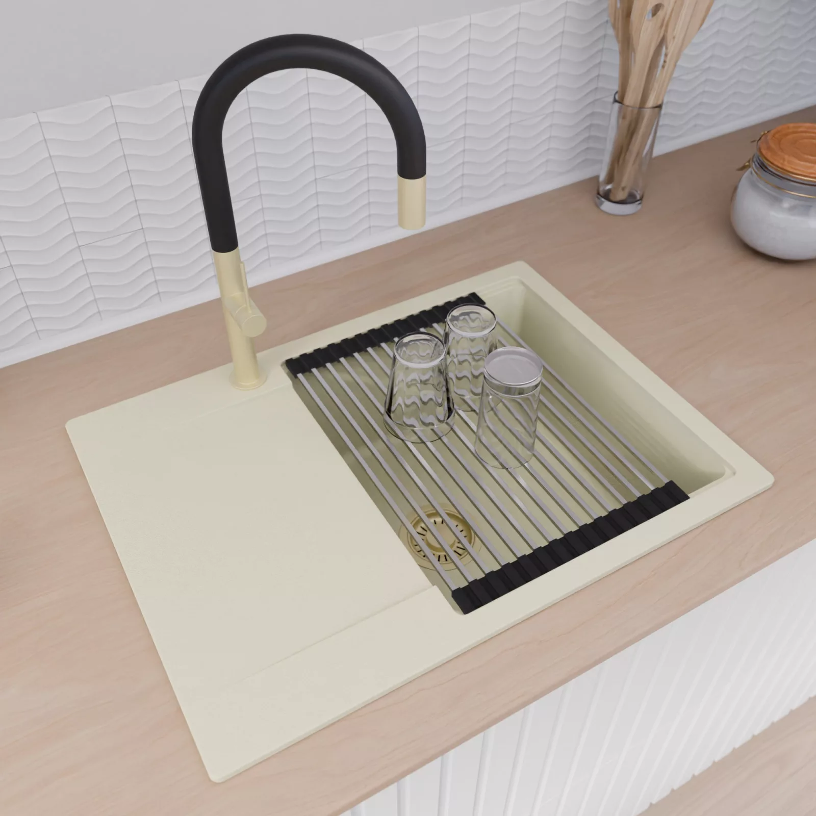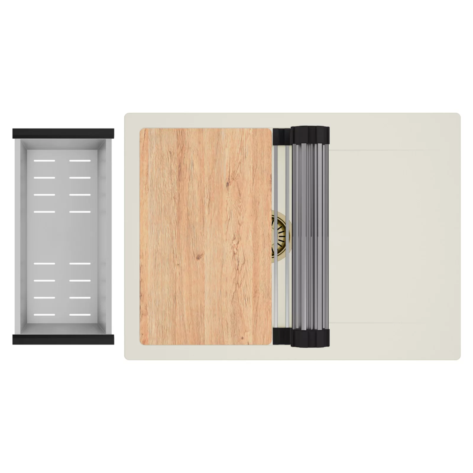 HD Onyx White 68-XL egymedencés gránit mosogatótálca szett, vágódeszkával, csepegtetőtálcával, vágódeszkával, acél csepegtetőráccsal és kosárral, tört fehér színben, szálcsiszolt arany leeresztő szifonnal