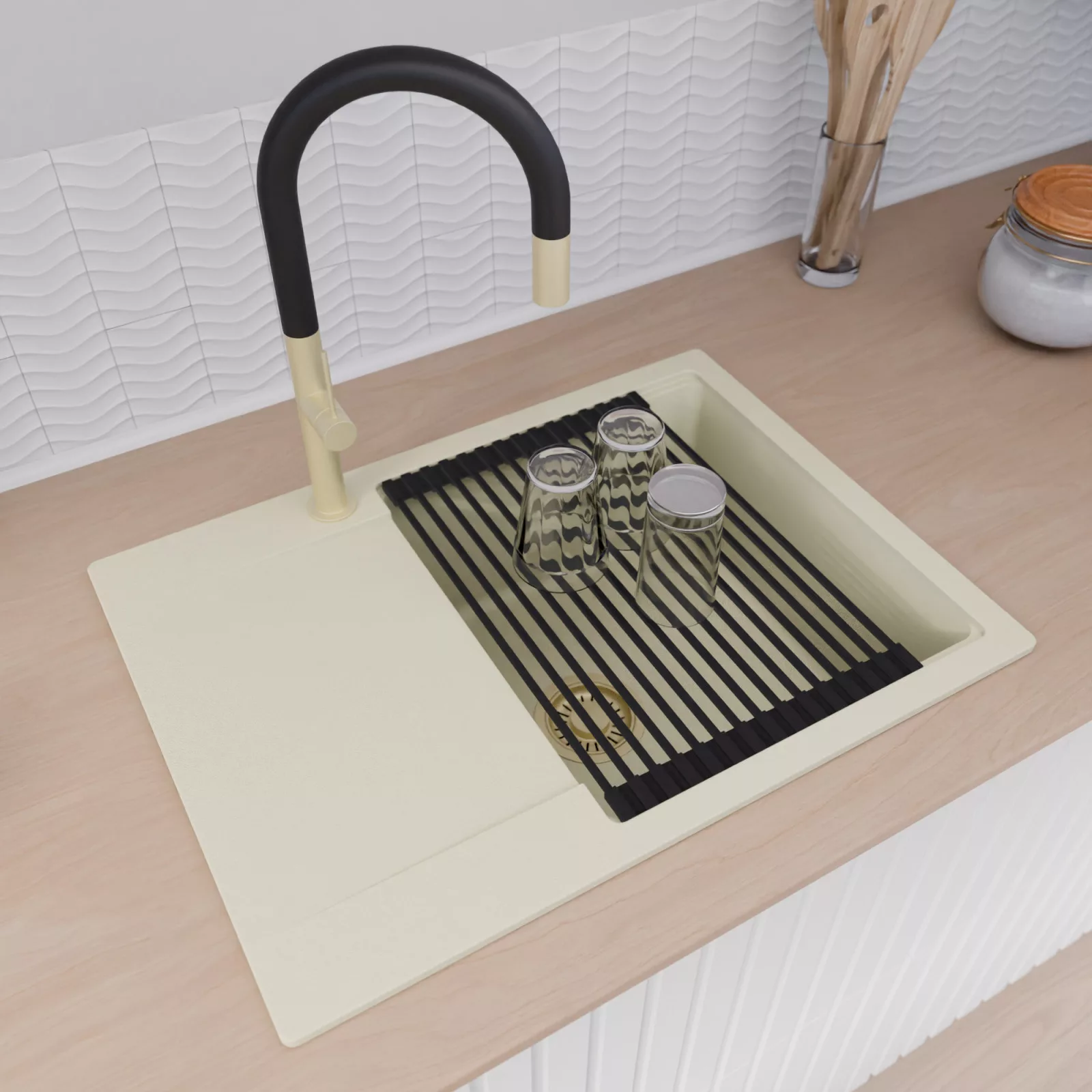 A mosogató prémium minőségű gránit kompozitból készült. Letisztult megjelenése mellett rendkívül praktikus, így bármilyen stílusú konyhába harmonikusan illeszkedik. A strapabíró gránit anyag hosszú távon is megbízható használatot garantál.