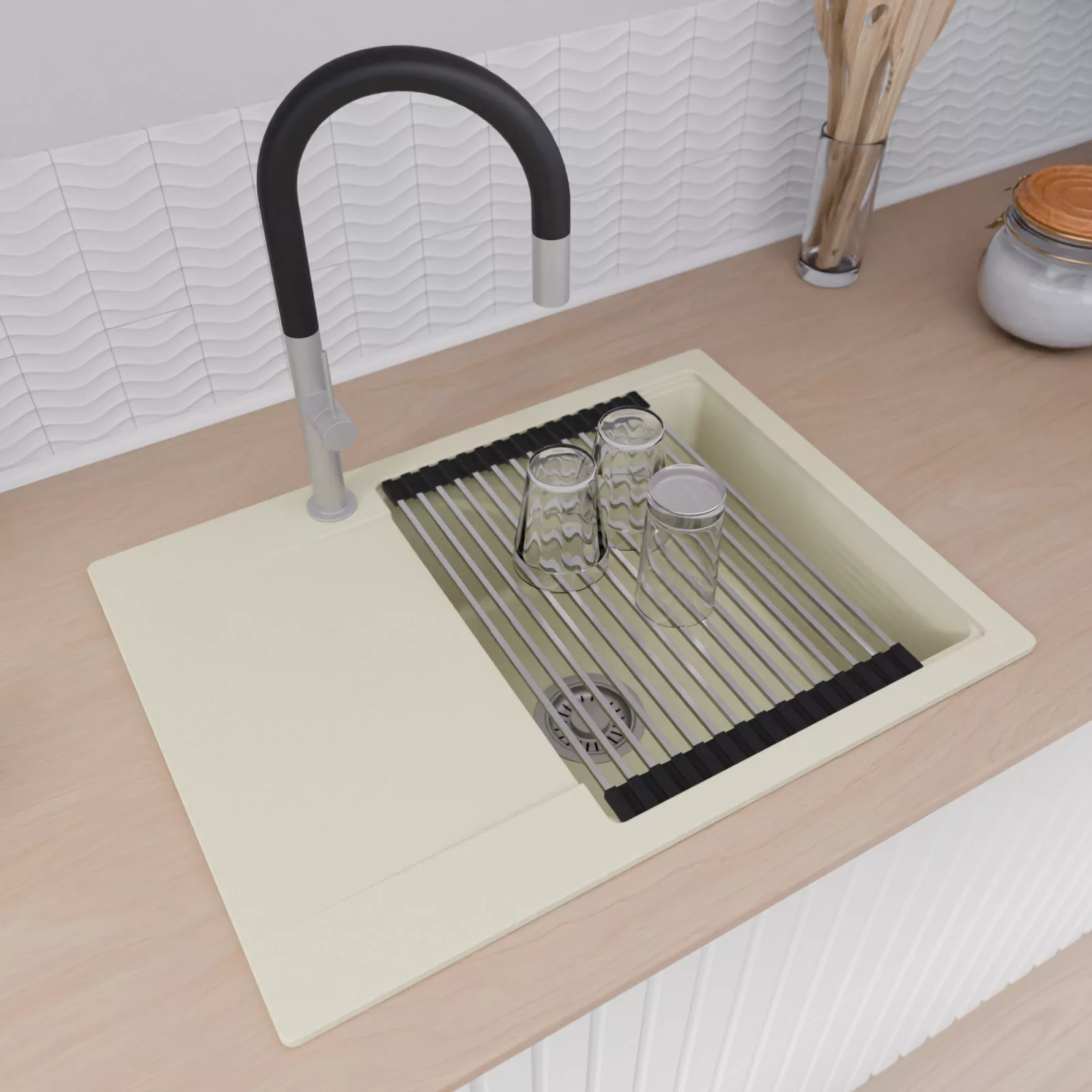A mosogató prémium minőségű gránit kompozitból készült. Letisztult megjelenése mellett rendkívül praktikus, így bármilyen stílusú konyhába harmonikusan illeszkedik. A strapabíró gránit anyag hosszú távon is megbízható használatot garantál.