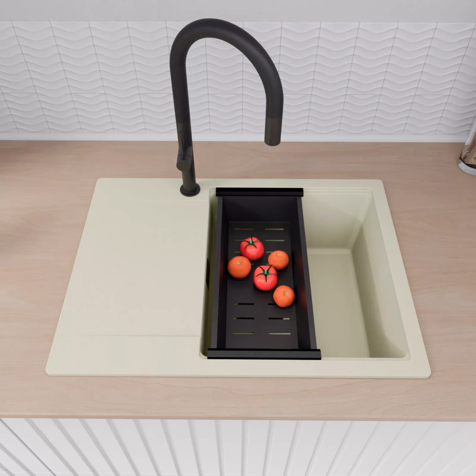 A mosogató prémium minőségű gránit kompozitból készült. Letisztult megjelenése mellett rendkívül praktikus, így bármilyen stílusú konyhába harmonikusan illeszkedik. A strapabíró gránit anyag hosszú távon is megbízható használatot garantál.