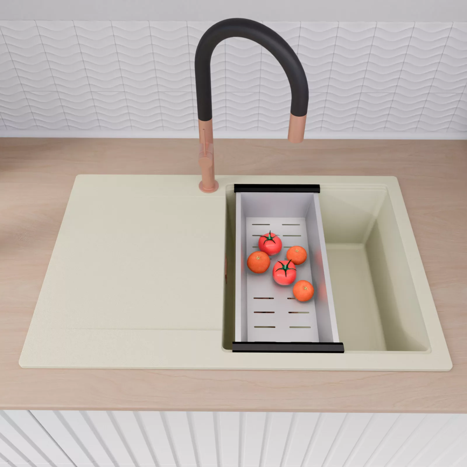 A HomeDepo SmartEdge Többfunkciós Peremrendszer egy intelligensen kialakított peremmegoldás, amely a mosogatót kompakt, mégis teljes értékű konyhai térré alakítja a mindennapok során. A speciális peremkialakítás lehetővé teszi a vágódeszka, a feltekerhető csepegtető rács, a gyümölcsmosó és a csepegtető kosár stabil, biztonságos és kényelmes elhelyezését közvetlenül a mosogató speciális belső peremén. A kiegészítők síkban csúsztathatók és szabadon kombinálhatók, így extra munkafelületet nyersz anélkül, hogy helyet foglalnál a konyhapulton – a mosogató valódi többfunkciós központtá válik.