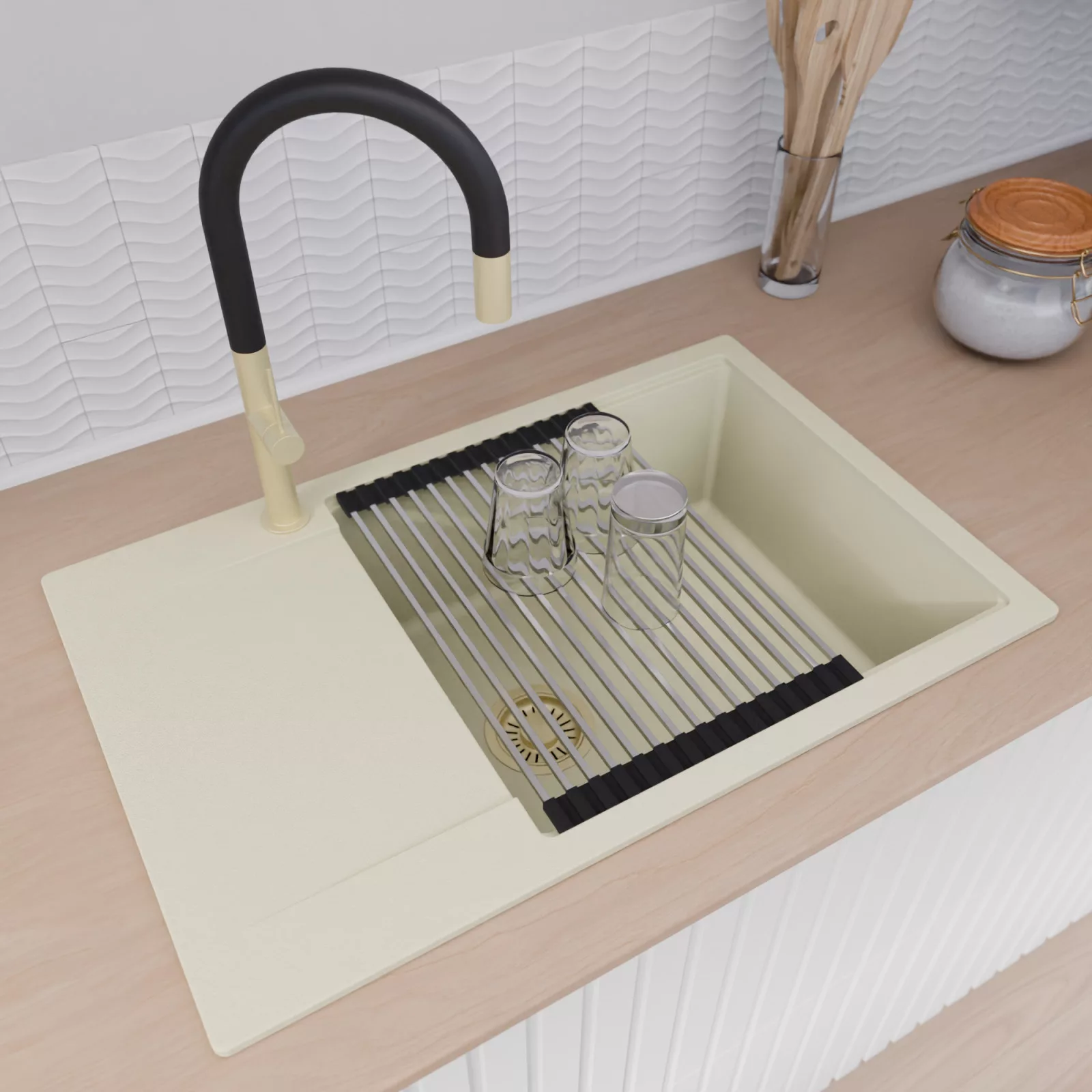 Mosogatónk magas természetes kőőrlemény-tartalmú gránit kompozitból készül, amely rendkívüli stabilitást és tartósságot biztosít. Az anyag ellenáll a magas hőmérsékletnek, a hirtelen hőingadozásoknak, valamint az ütéseknek és karcolásoknak is. Sima, zárt felülete könnyen tisztán tartható, ellenáll a foltosodásnak és az elszíneződéseknek, így hosszú éveken át megőrzi esztétikus megjelenését. Meggyőződésünk, hogy ezzel a gránit mosogatóval a mindennapi konyhai teendők kényelmesebbé és élvezetesebbé válnak.
