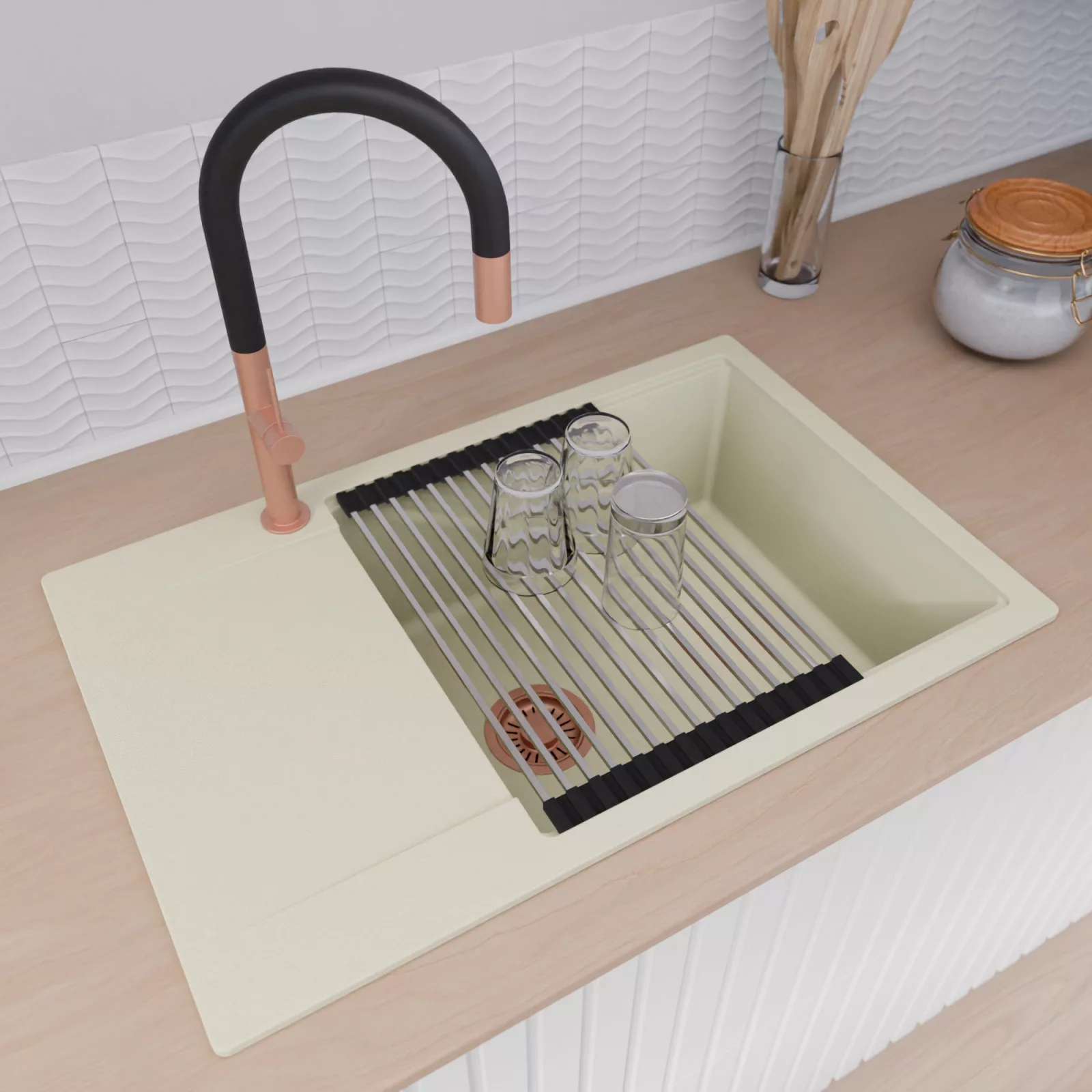 Mosogatónk magas természetes kőőrlemény-tartalmú gránit kompozitból készül, amely rendkívüli stabilitást és tartósságot biztosít. Az anyag ellenáll a magas hőmérsékletnek, a hirtelen hőingadozásoknak, valamint az ütéseknek és karcolásoknak is. Sima, zárt felülete könnyen tisztán tartható, ellenáll a foltosodásnak és az elszíneződéseknek, így hosszú éveken át megőrzi esztétikus megjelenését. Meggyőződésünk, hogy ezzel a gránit mosogatóval a mindennapi konyhai teendők kényelmesebbé és élvezetesebbé válnak.