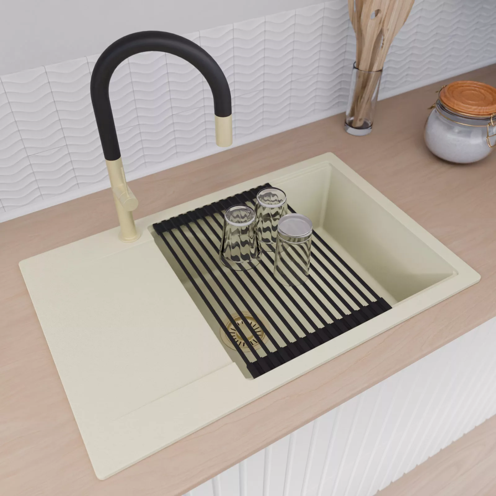 A mosogató prémium minőségű gránit kompozitból készült. Letisztult megjelenése mellett rendkívül praktikus, így bármilyen stílusú konyhába harmonikusan illeszkedik. A strapabíró gránit anyag hosszú távon is megbízható használatot garantál.