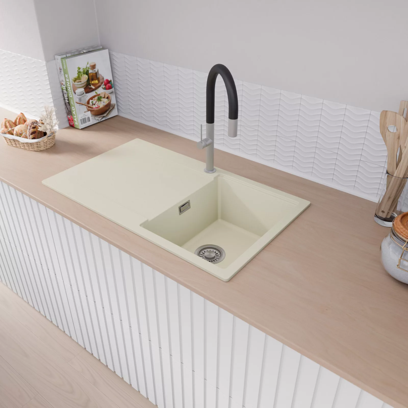 A mosogató prémium minőségű gránit kompozitból készült, amely kiváló ellenállást biztosít a mindennapi használat során keletkező karcolásokkal szemben. A strapabíró gránit felület hosszú távon is megőrzi esztétikus megjelenését, így a mosogató intenzív igénybevétel mellett is megmarad újszerű állapotában.