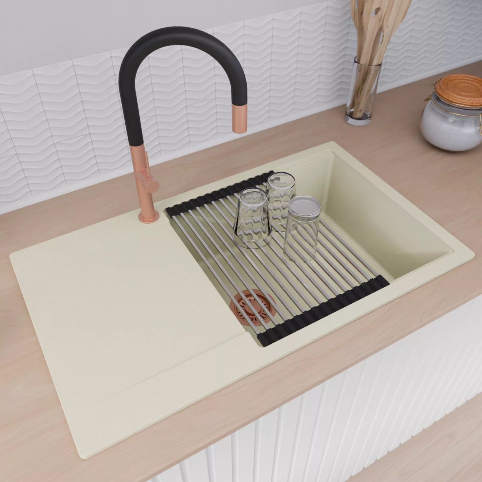 A mosogató prémium minőségű gránit kompozitból készült. Letisztult megjelenése mellett rendkívül praktikus, így bármilyen stílusú konyhába harmonikusan illeszkedik. A strapabíró gránit anyag hosszú távon is megbízható használatot garantál.