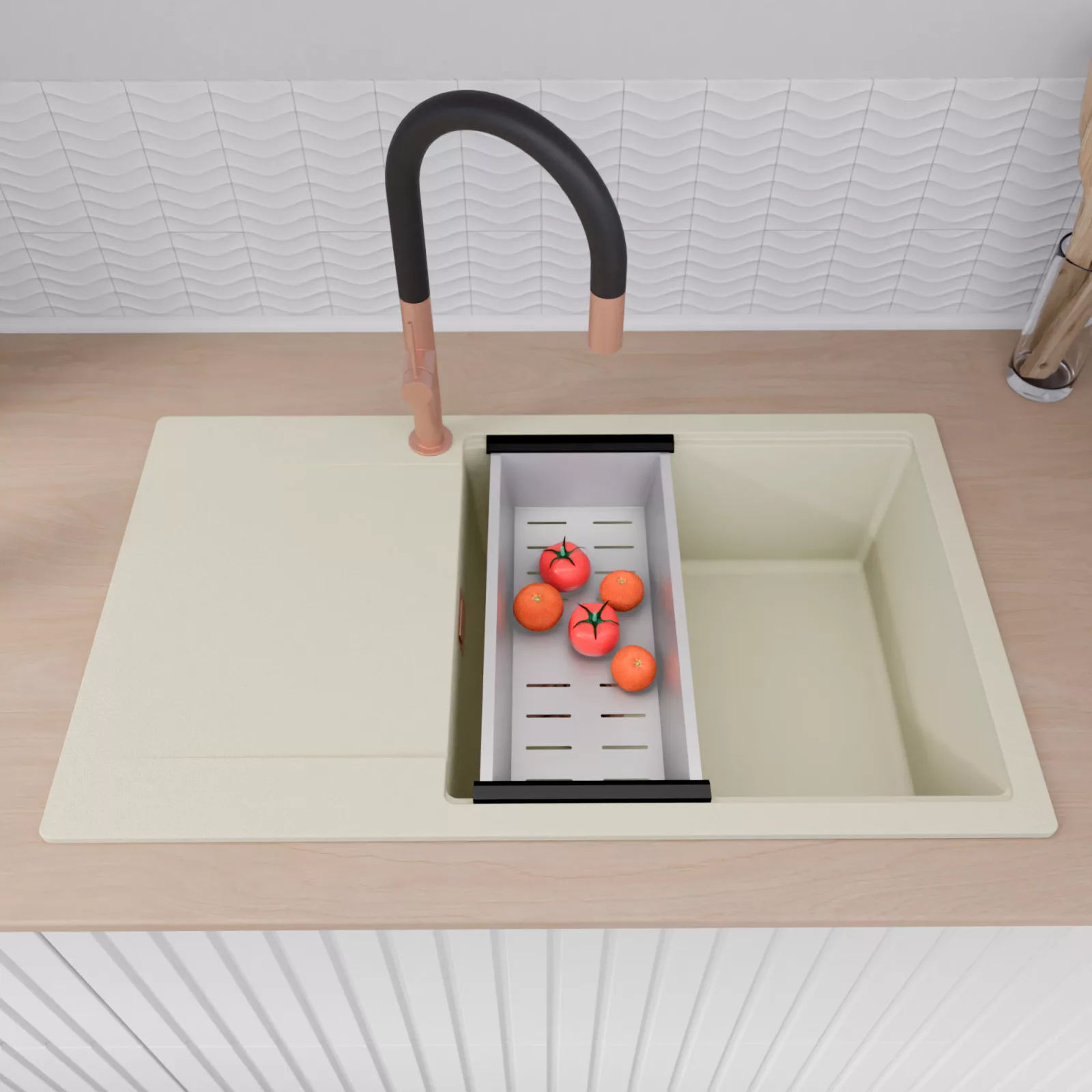 Mosogatónk magas természetes kőőrlemény-tartalmú gránit kompozitból készül, amely rendkívüli stabilitást és tartósságot biztosít. Az anyag ellenáll a magas hőmérsékletnek, a hirtelen hőingadozásoknak, valamint az ütéseknek és karcolásoknak is. Sima, zárt felülete könnyen tisztán tartható, ellenáll a foltosodásnak és az elszíneződéseknek, így hosszú éveken át megőrzi esztétikus megjelenését. Meggyőződésünk, hogy ezzel a gránit mosogatóval a mindennapi konyhai teendők kényelmesebbé és élvezetesebbé válnak.