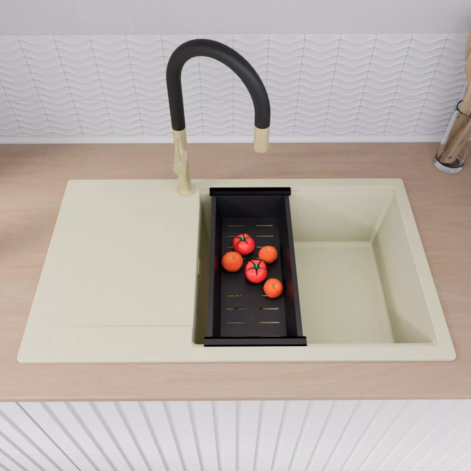 A mosogató prémium minőségű gránit kompozitból készült. Letisztult megjelenése mellett rendkívül praktikus, így bármilyen stílusú konyhába harmonikusan illeszkedik. A strapabíró gránit anyag hosszú távon is megbízható használatot garantál.