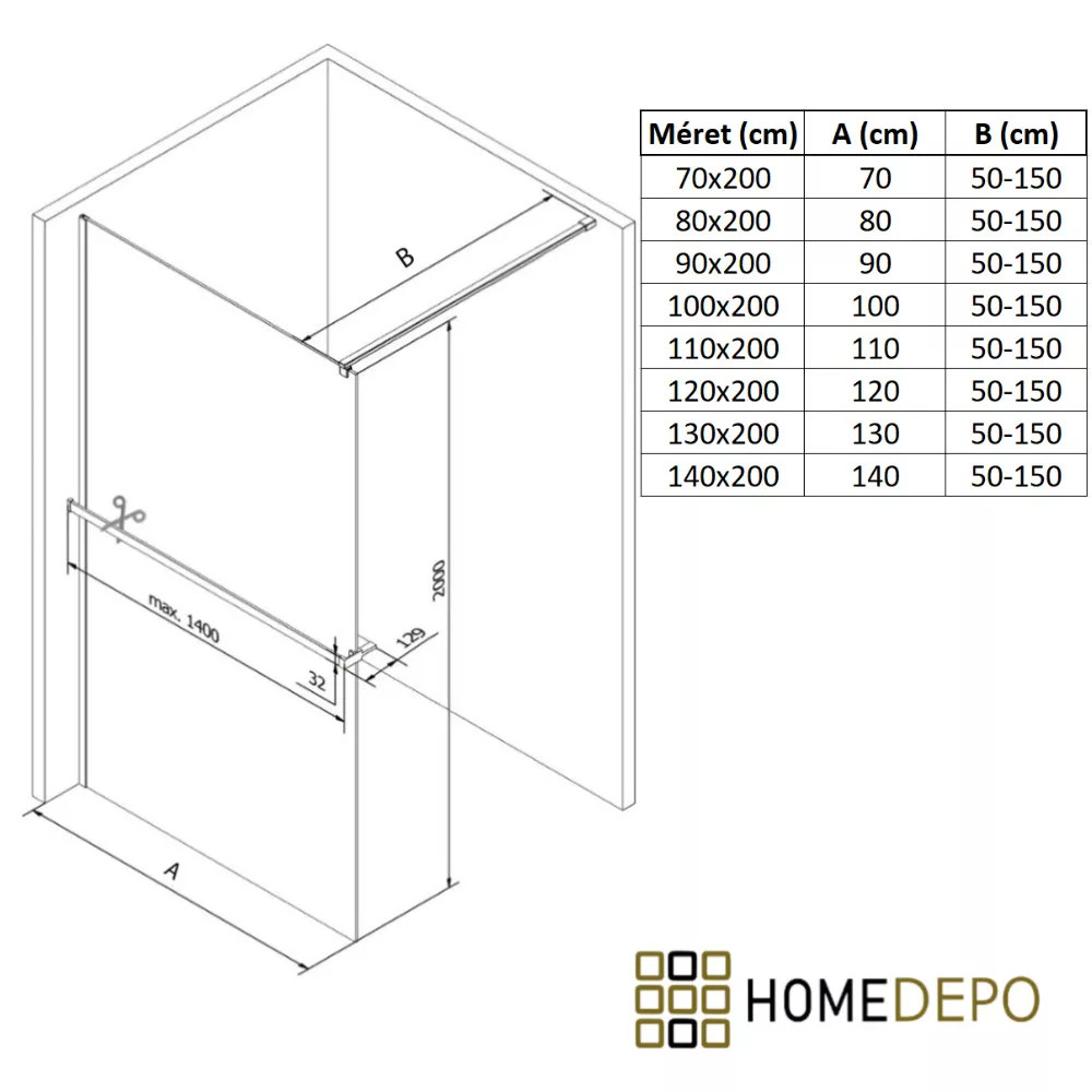 - Felszereltség: fehér állítható alumínium profil, 50-150 cm között vágható rozsdamentes acél távtartó és fehér színű alumínium polc és törölközőtartó