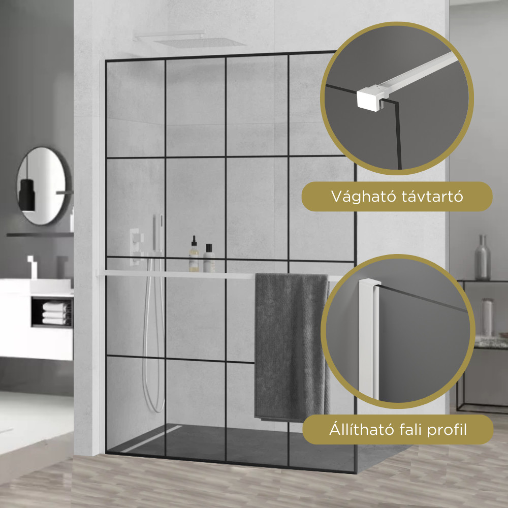 A mai modern stílusnak megfelelően alkottuk meg a visszafogott, mégis szemet gyönyörködtető Walk-In zuhanyfalunkat. Helyet kaphat bármilyen stílusú fürdőszobában, képes a belső összképhez hozzájárulni. A fehér színű profilok, a távtartó és a tusfürdő tartó polc remek színárnyalatban készülnek el, ami a különböző megvilágítások alatt is kellemes érzetet keltenek. A polc egyaránt alkalmas a tusfürdő tárolására és a törölköző tárolására, így biztosítva még nagyobb kényelmet a használat során!