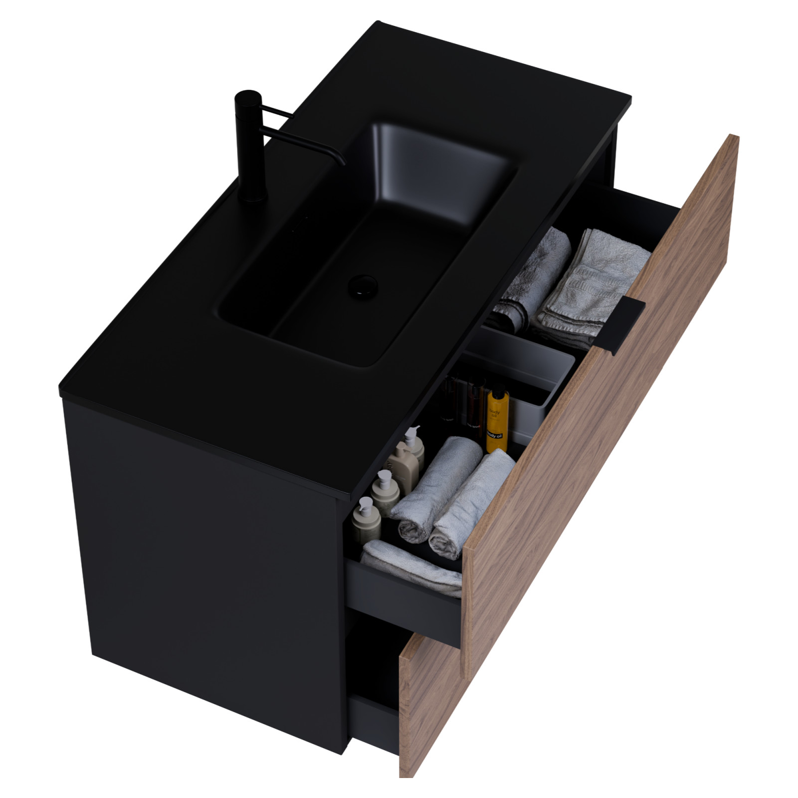 matt fekete mosdószekrény, teljes kihúzhatóságú fiókokkal