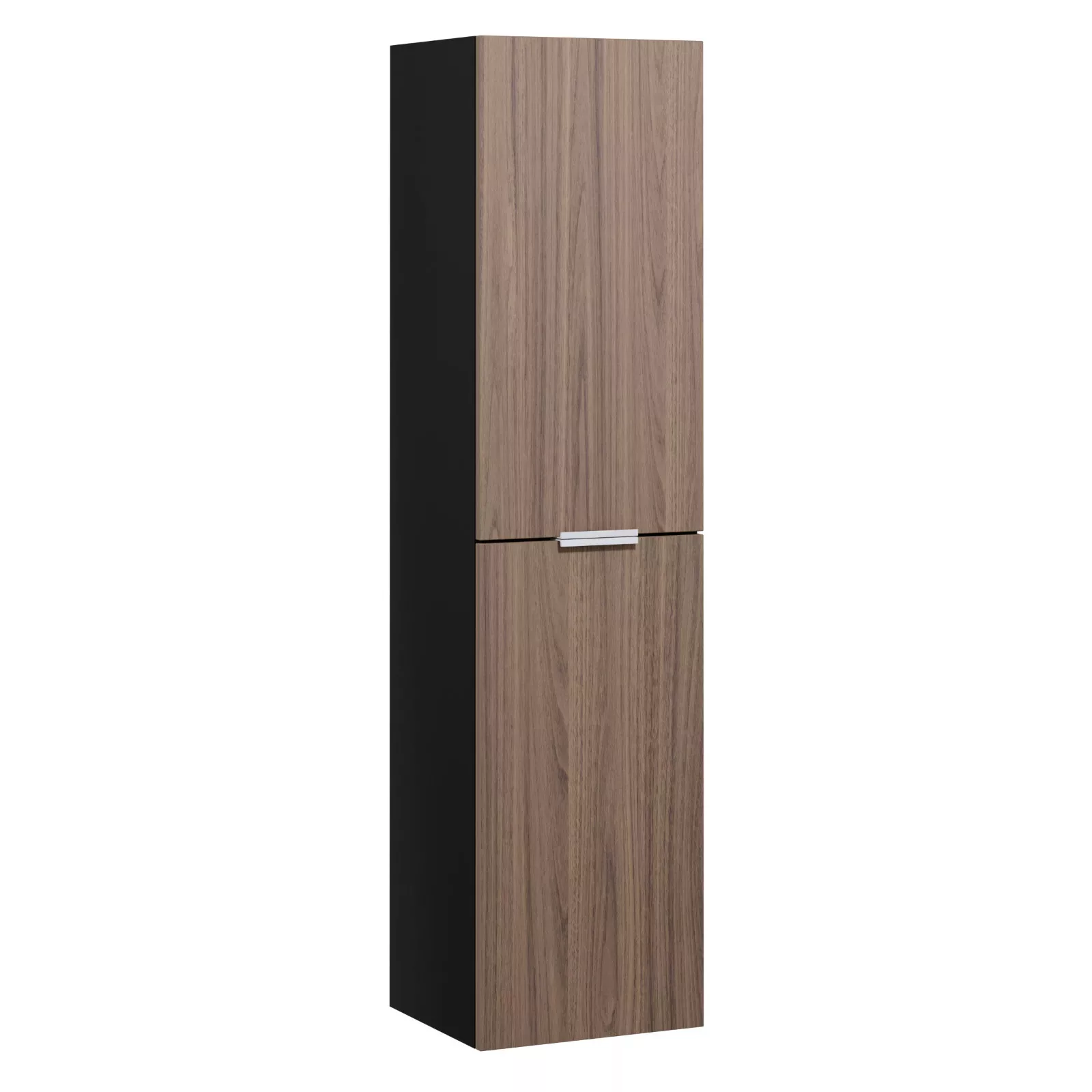 matt fekete magasszekrény, tölgyfa színű frontpanellel