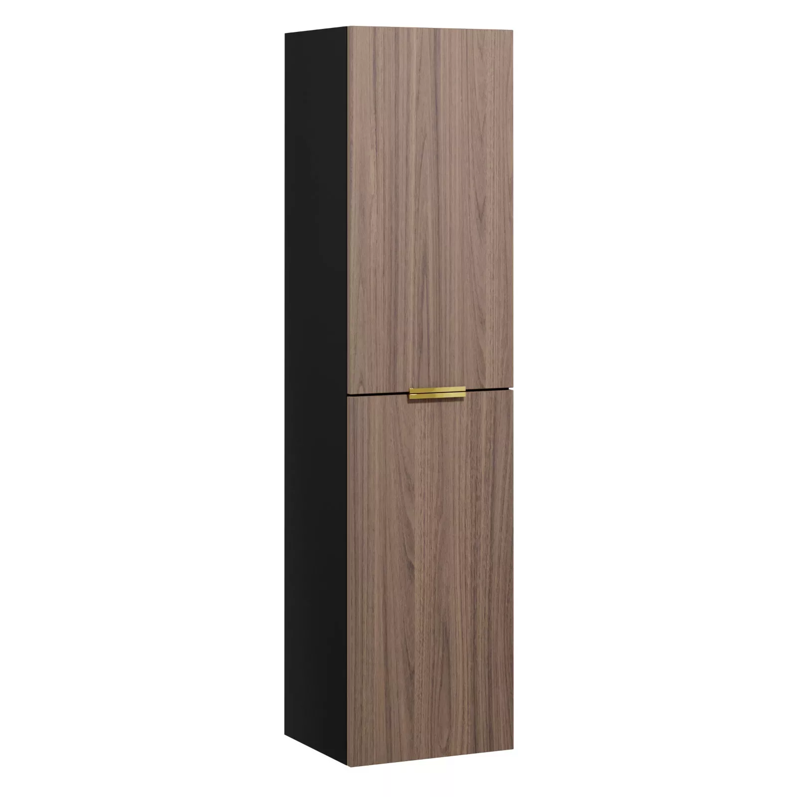 matt fekete magasszekrény, tölgyfa színű frontpanellel