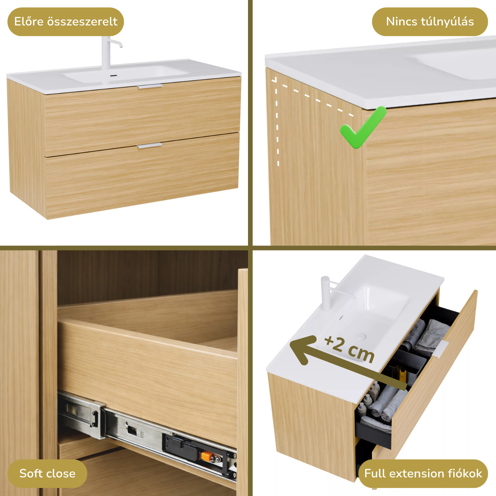 A bútor előre összerelt állapotban szállítjuk, így Önnek nincs más teendője már vele, csak fel kell rögzíteni a falra és fehelyezni a mosdót, illetve a fiók frontot.