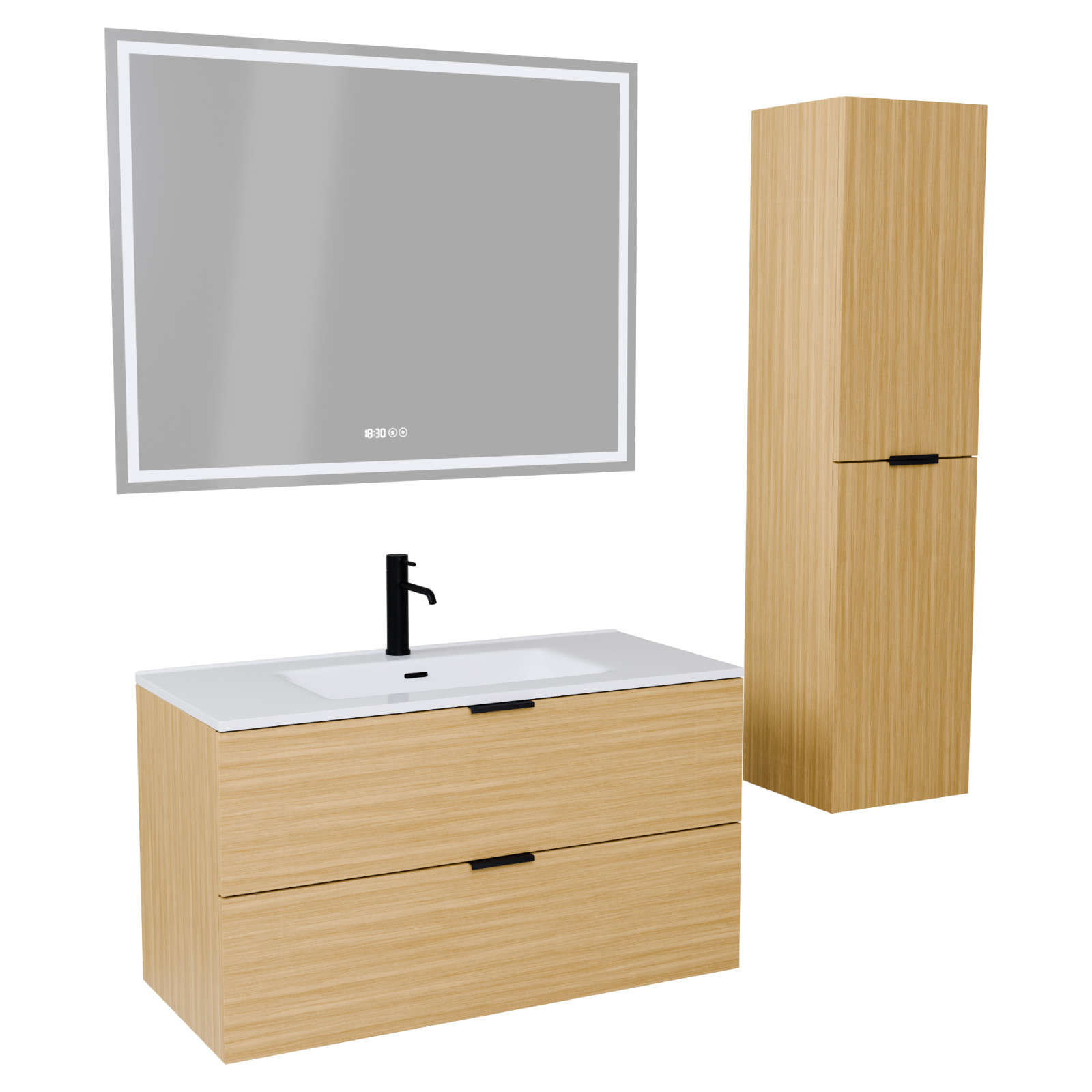 Szett tartalma: Mosdószekrény mosdóval, okos tükör, magasszekrény