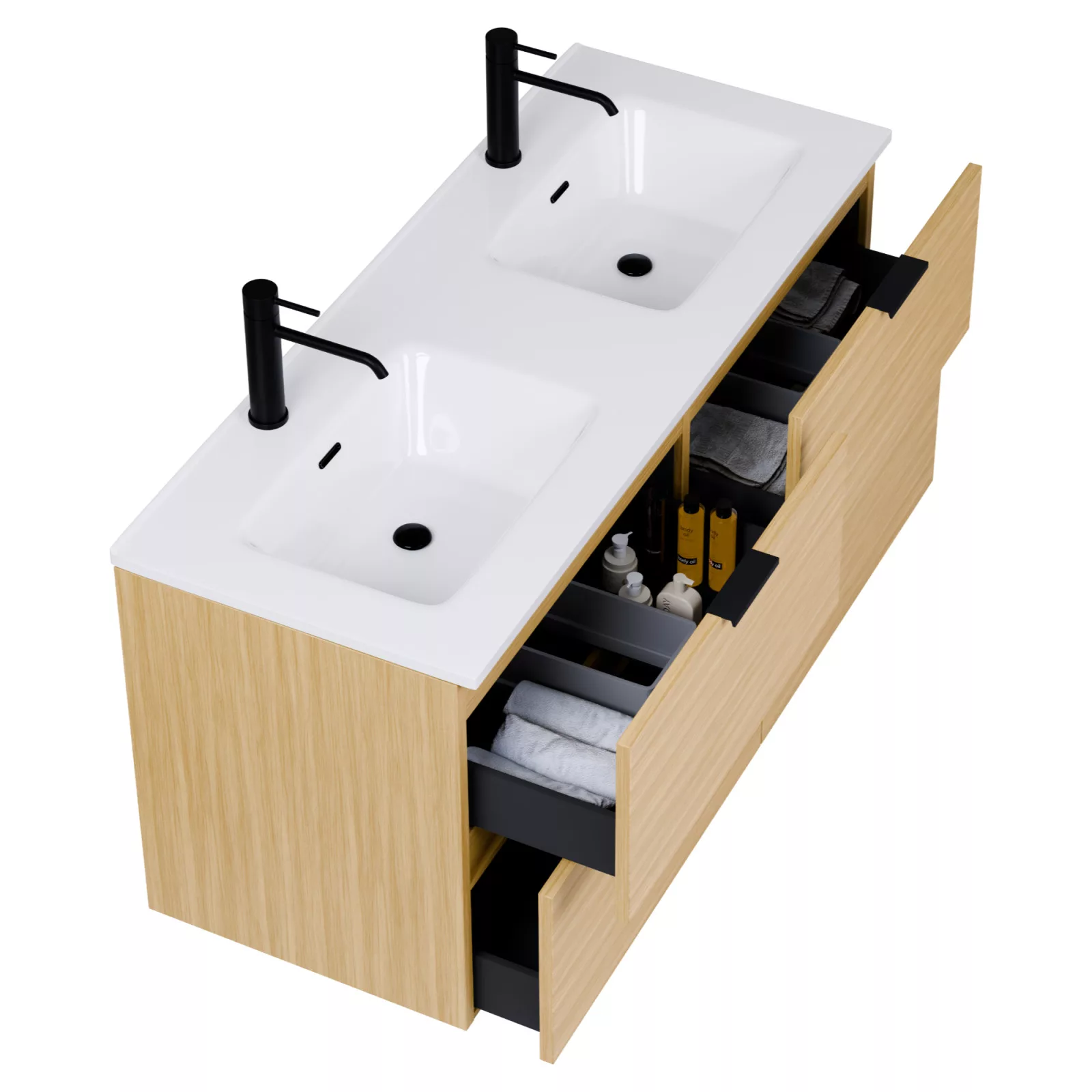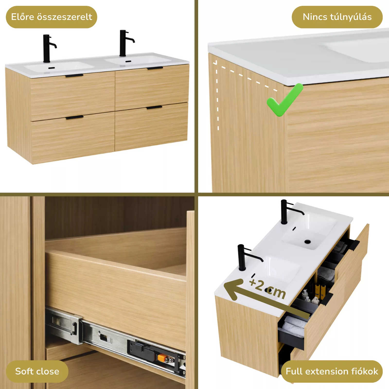 Saját márkás 120 cm széles fali mosdószekrény hikoridió színben, matt fekete fogantyúkkal, rejtett fióksínnel és önbehúzos technológiával ellátott.