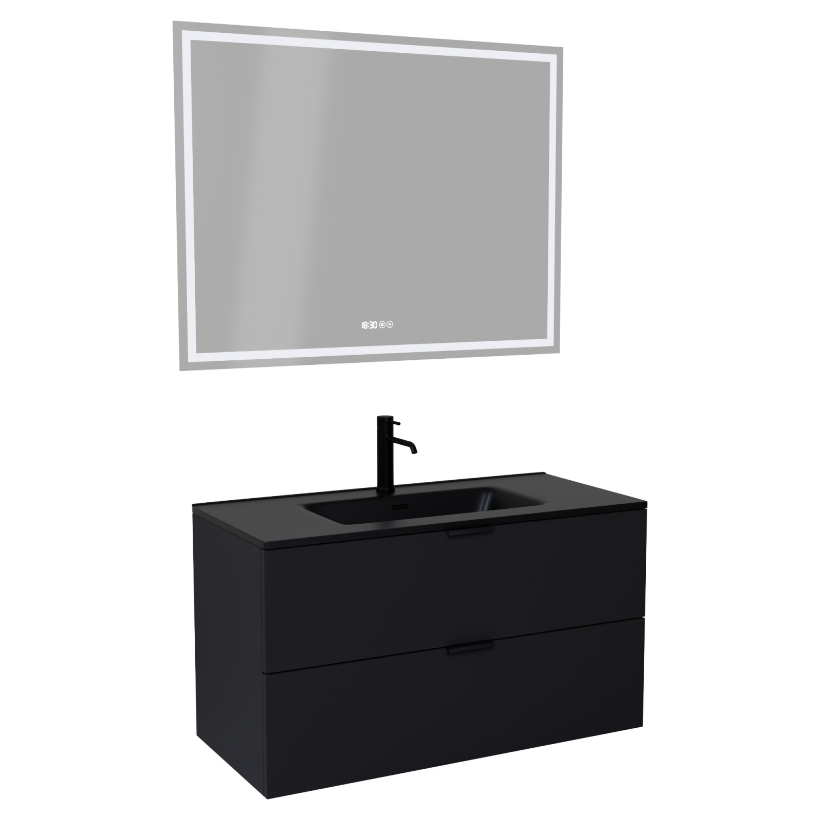 Saját márkás 100 cm széles komplett fürdőszoba bútor fali mosdószekrénnyel matt fekete színben, matt fekete fogantyúkkal, fekete slim mosdóval és fali okos LED tükörrel.