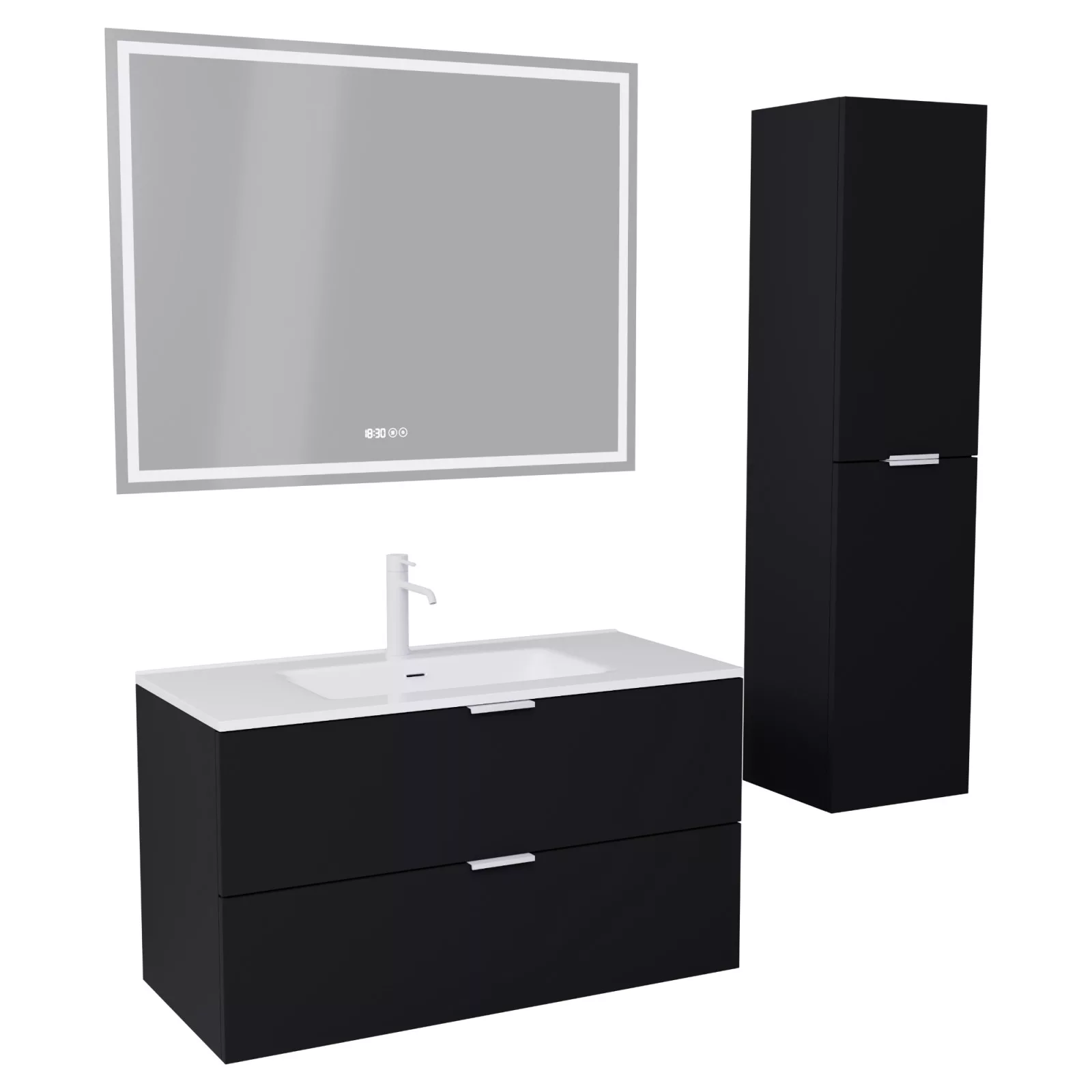 Saját márkás 100 cm széles komplett fürdőszoba bútor fali mosdószekrénnyel matt fekete színben, matt fehér fogantyúkkal, okos LED tükörrel és magasszekrénnyel.