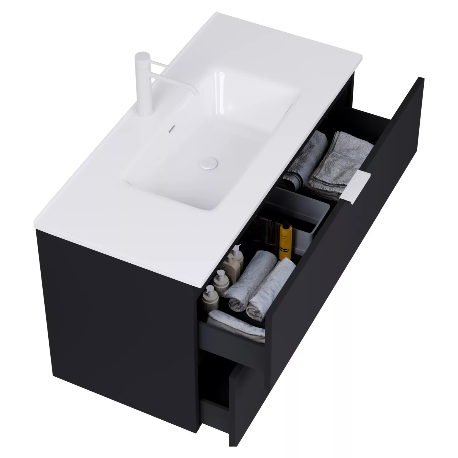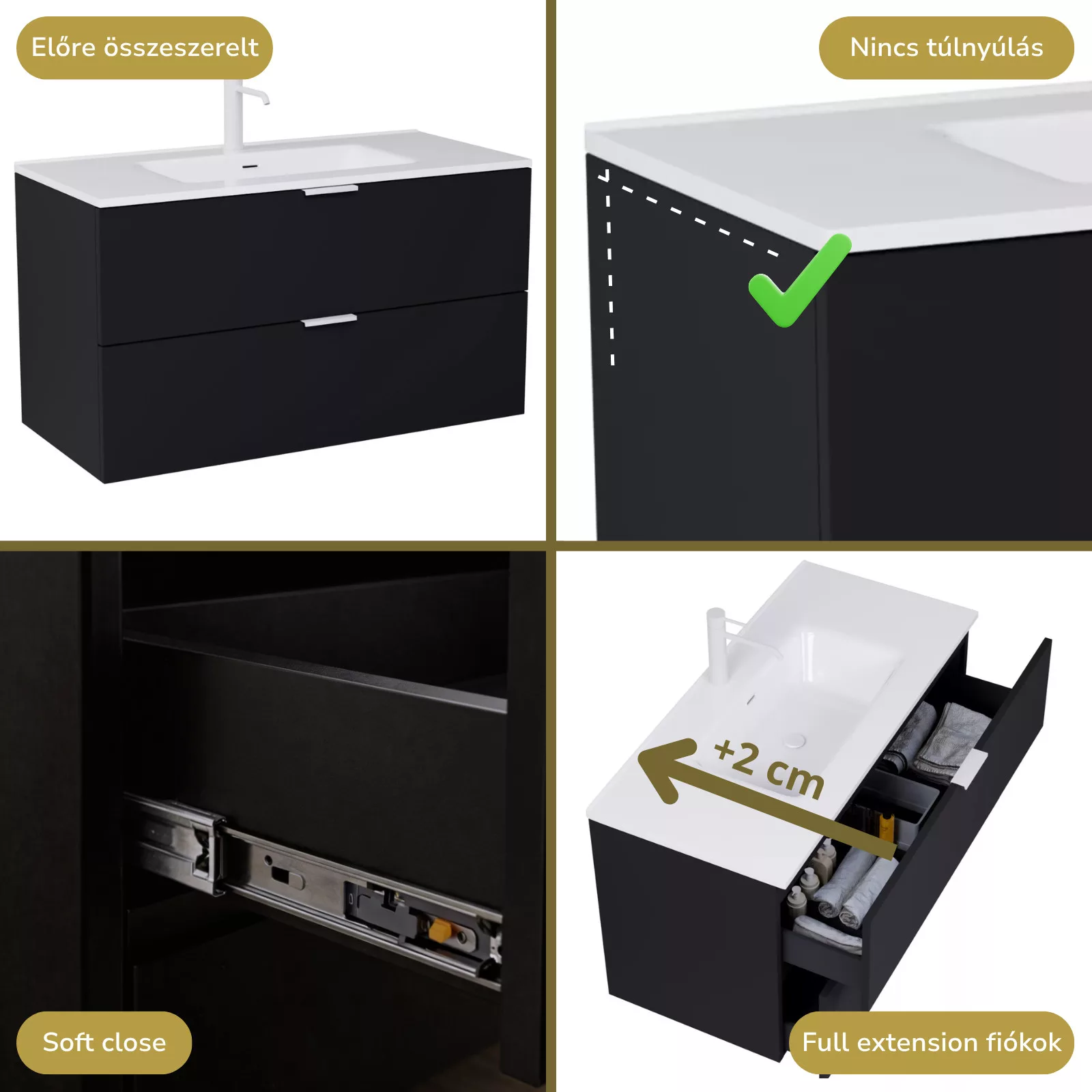 • matt fekete mosdószekrény, teljes kihúzhatóságú fiókokkal