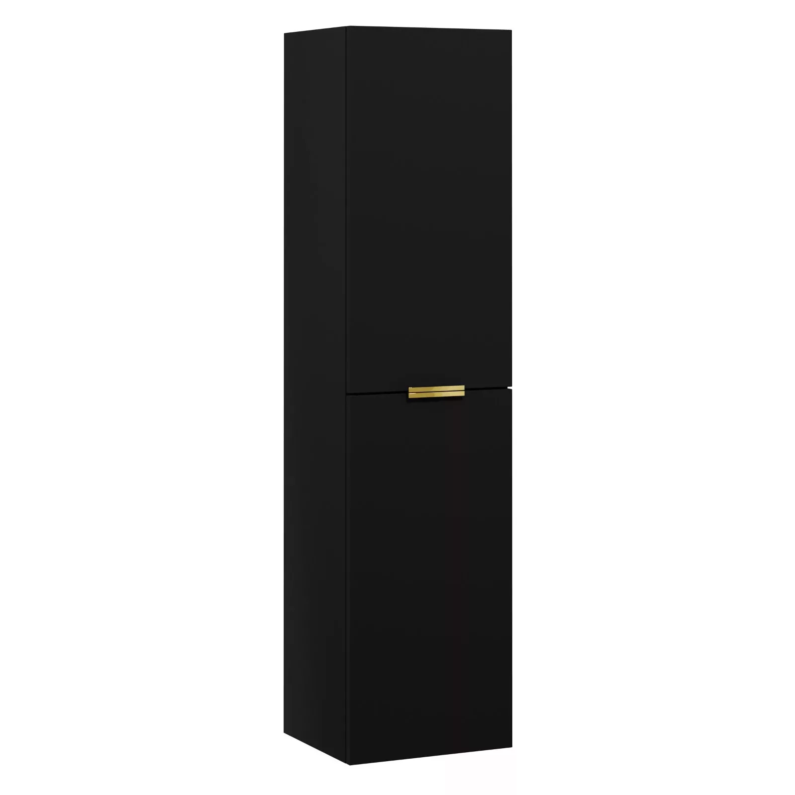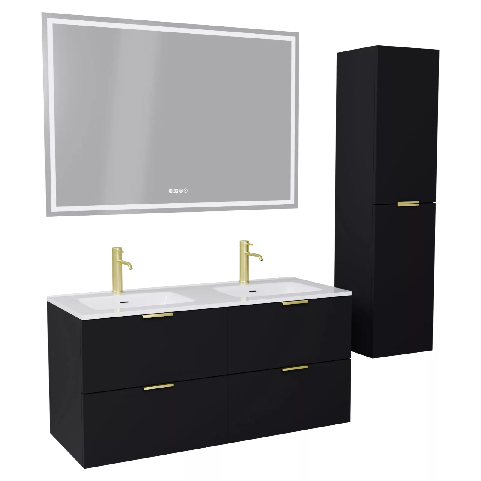 HD Palermo Matt Black 120 komplett fürdőszoba bútor szett fali mosdószekrénnyel, szálcsiszolt arany fogantyúkkal, tükörrel és magasszekrénnyel