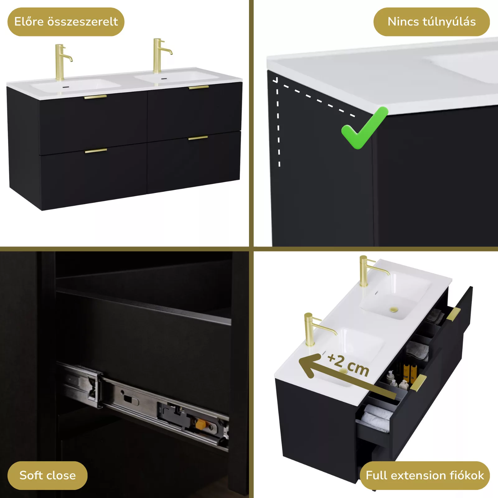 • matt fekete mosdószekrény, teljes kihúzhatóságú fiókokkal