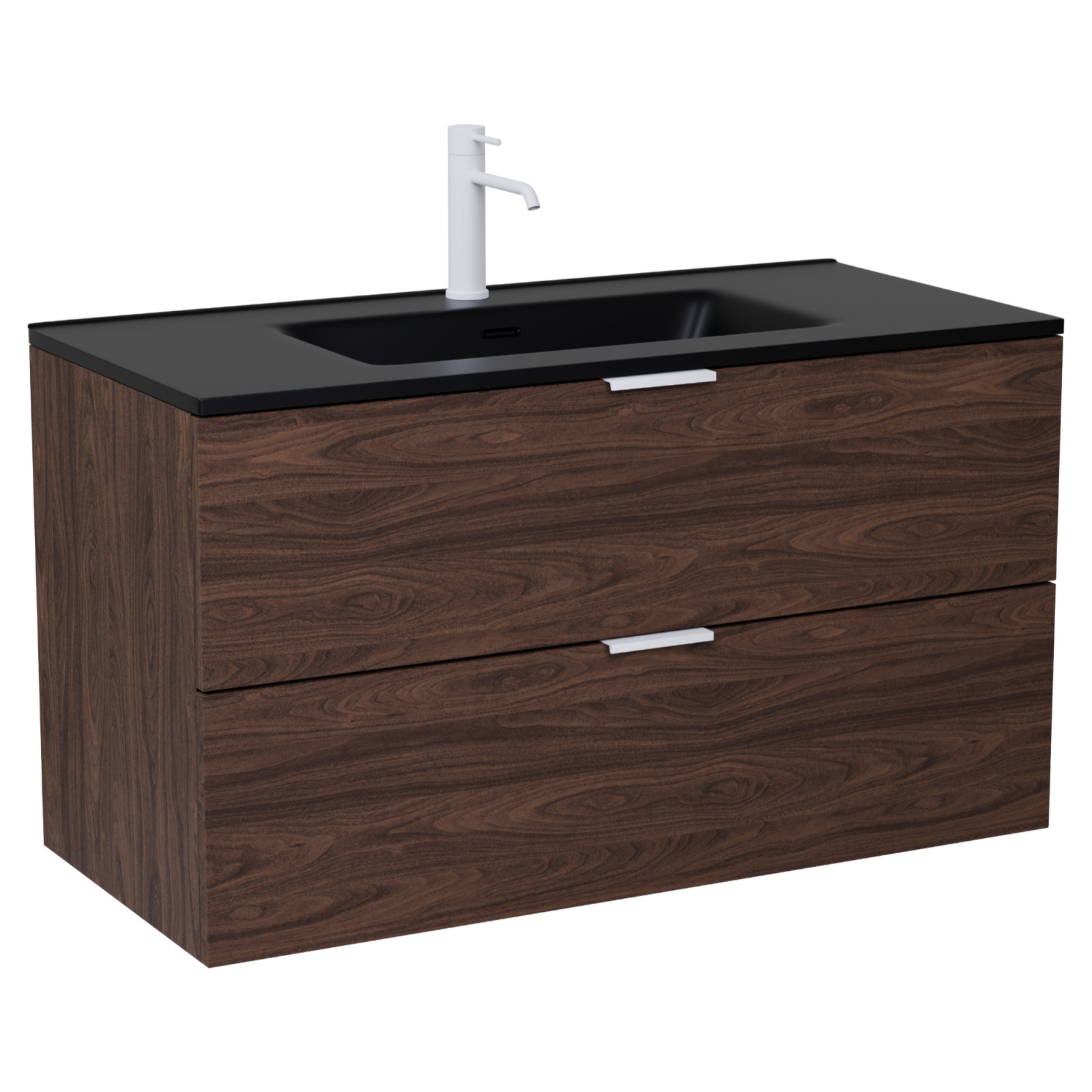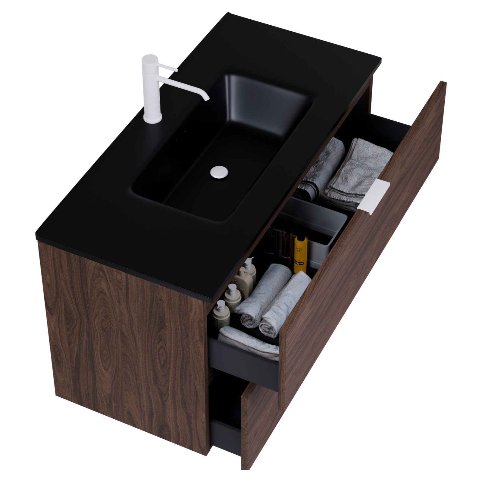 Saját márkás 100 cm széles fali mosdószekrény mogyoró színben, matt fehér fogantyúkkal, fekete slim mosdóval, rejtett fióksínnel és önbehúzos technológiával ellátott.
