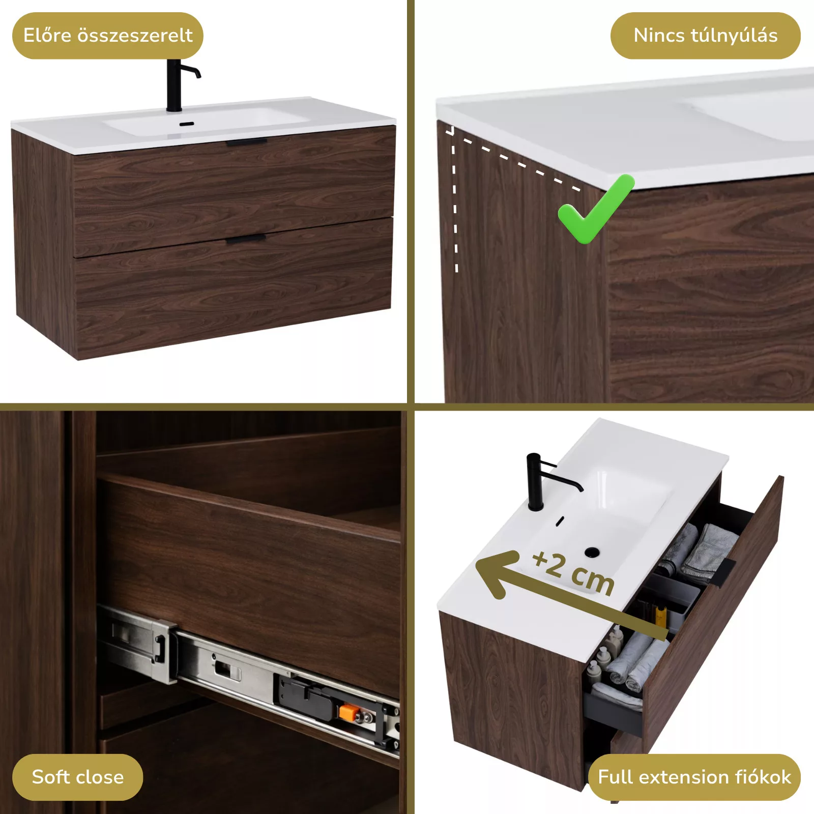 • mogyoró színű mosdószerkény, teljes kihúzhatóságú fiókokkal