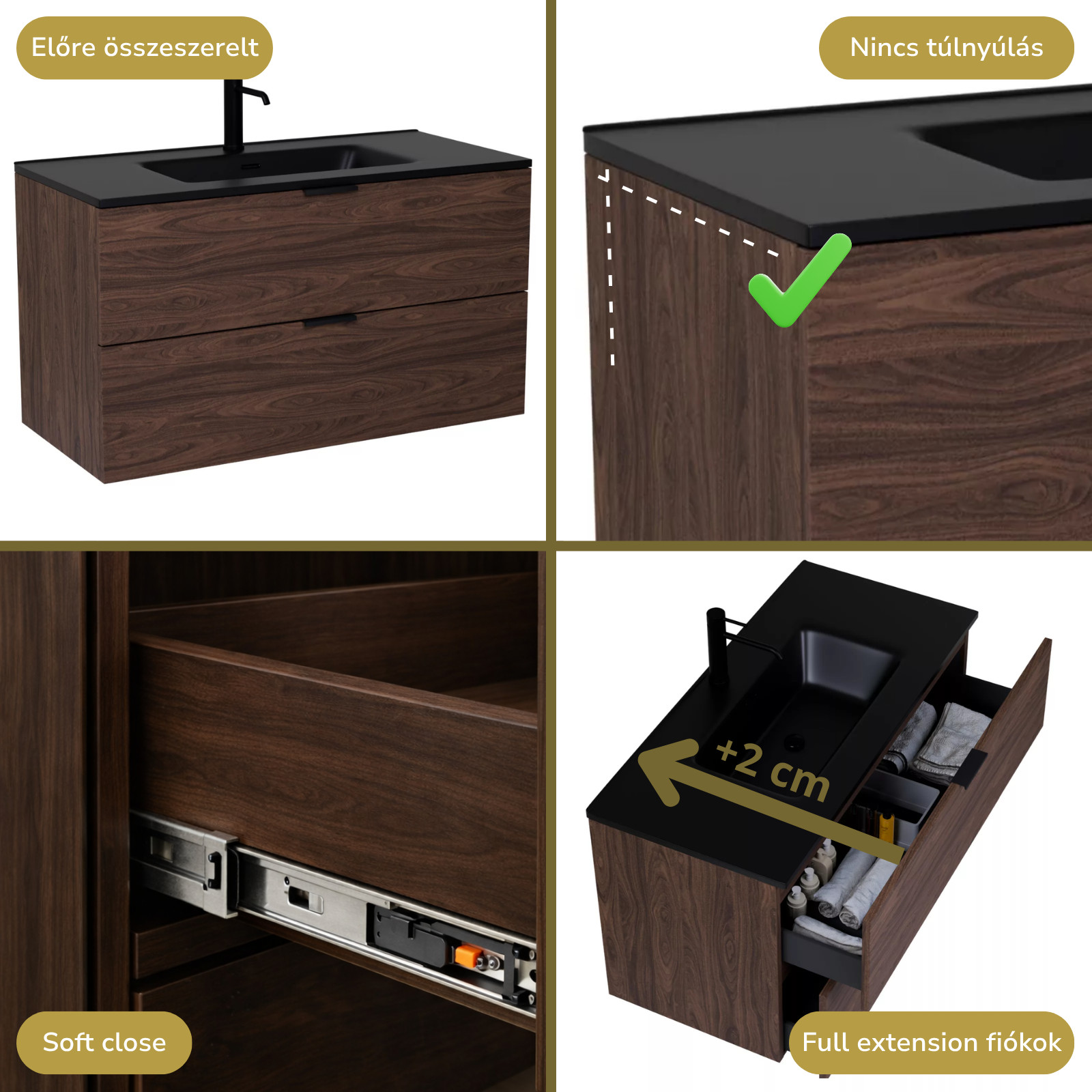 Saját márkás 100 cm széles fali mosdószekrény mogyoró színben, matt fekete fogantyúkkal, fekete slim mosdóval, rejtett fióksínnel és önbehúzos technológiával ellátott.