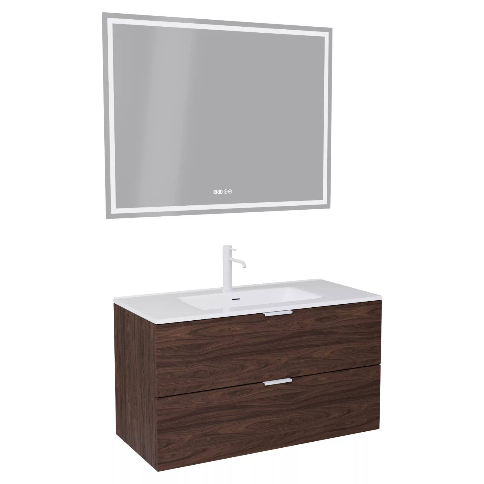 Saját márkás 100 cm széles komplett fürdőszoba bútor fali mosdószekrénnyel mogyoró színben, matt fehér fogantyúkkal, fényes fehér slim mosdóval és fali okos LED tükörrel.