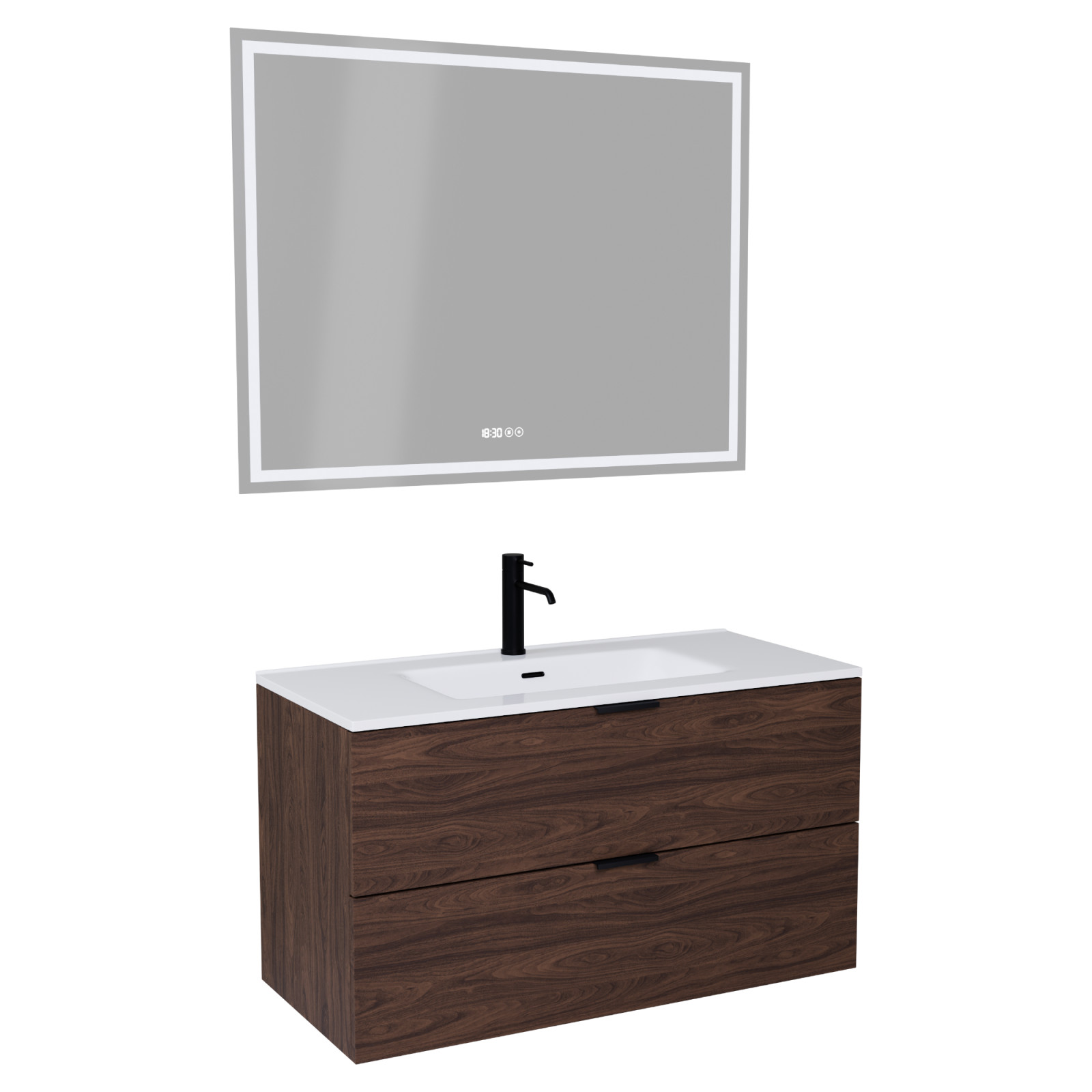 Saját márkás 100 cm széles komplett fürdőszoba bútor fali mosdószekrénnyel mogyoró színben, matt fekete fogantyúkkal, fényes fehér slim mosdóval és fali okos LED tükörrel.