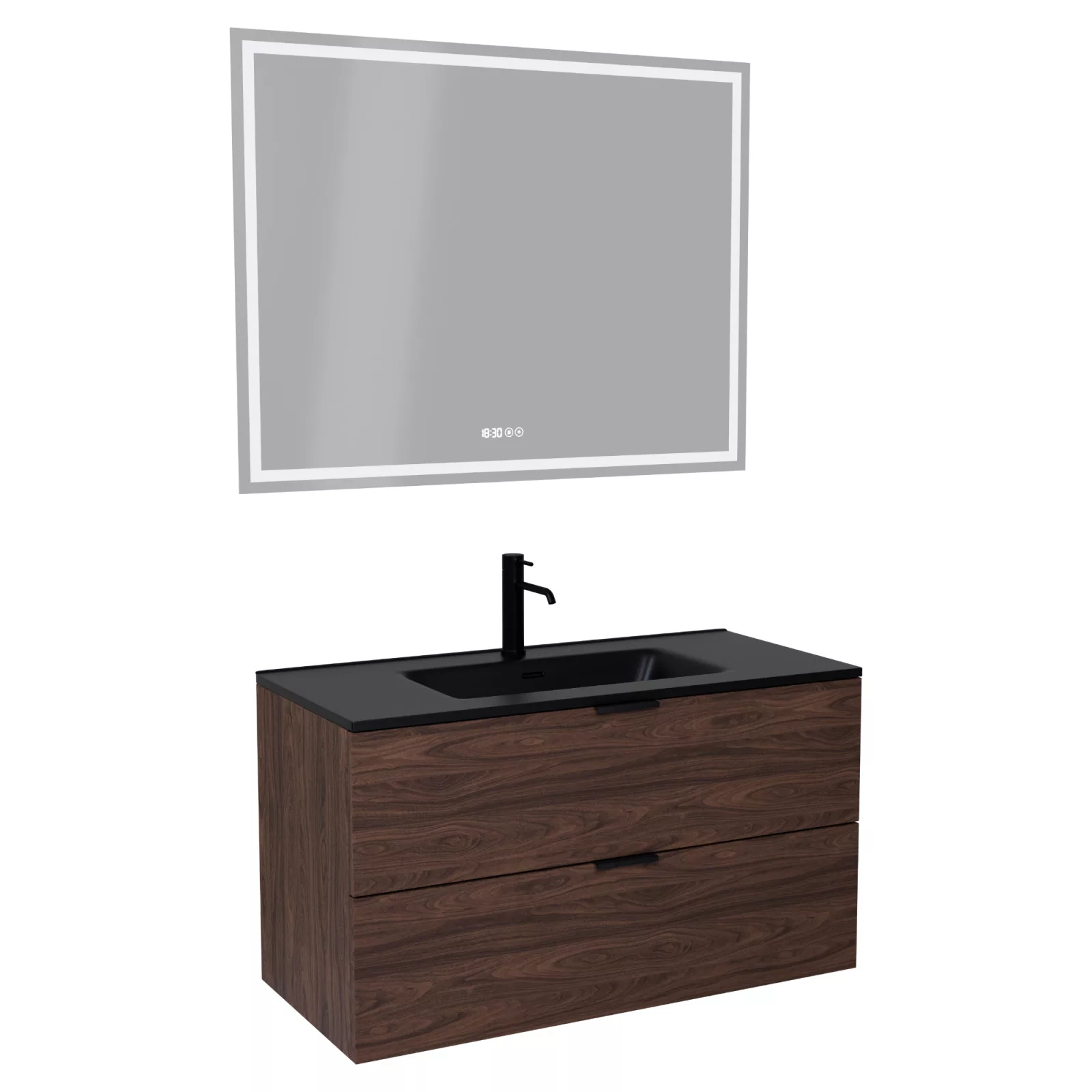 Saját márkás 100 cm széles komplett fürdőszoba bútor fali mosdószekrénnyel mogyoró színben, matt fekete fogantyúkkal, fekete slim mosdóval és fali okos LED tükörrel.