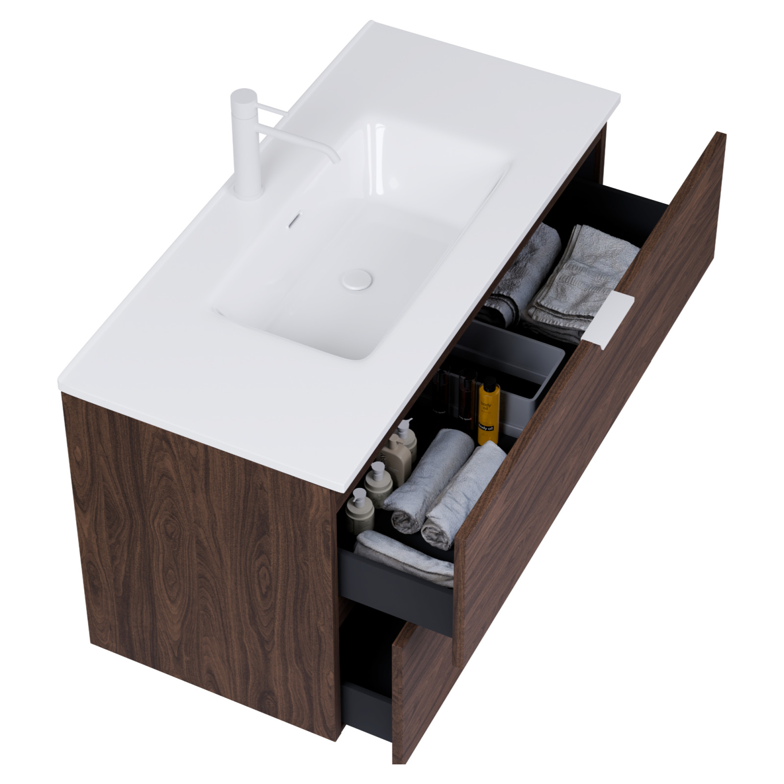 mogyoró színű mosdószerkény, teljes kihúzhatóságú fiókokkal