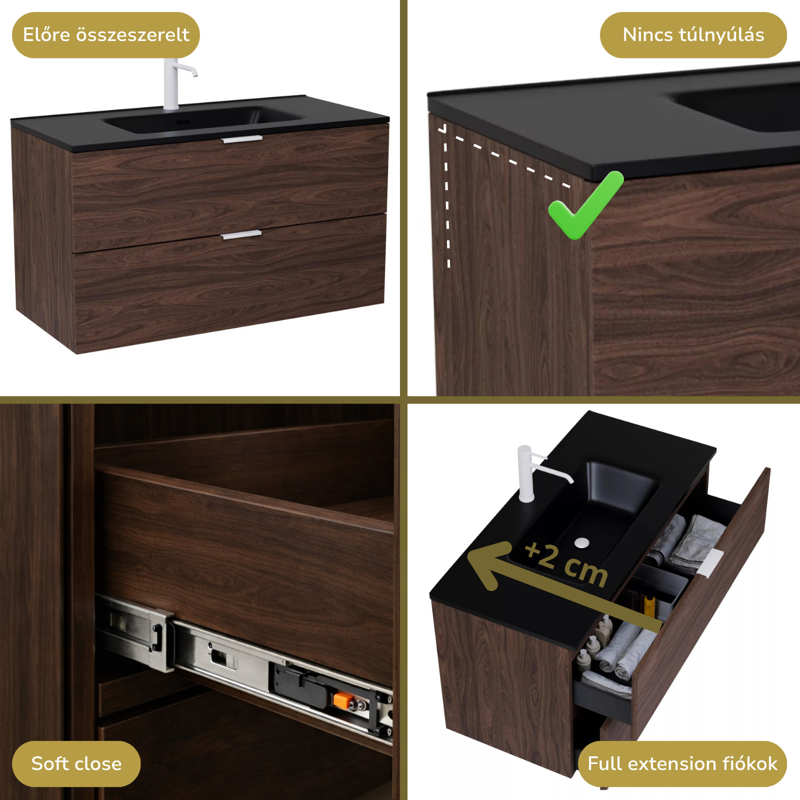 mogyoró színű mosdószerkény, teljes kihúzhatóságú fiókokkal