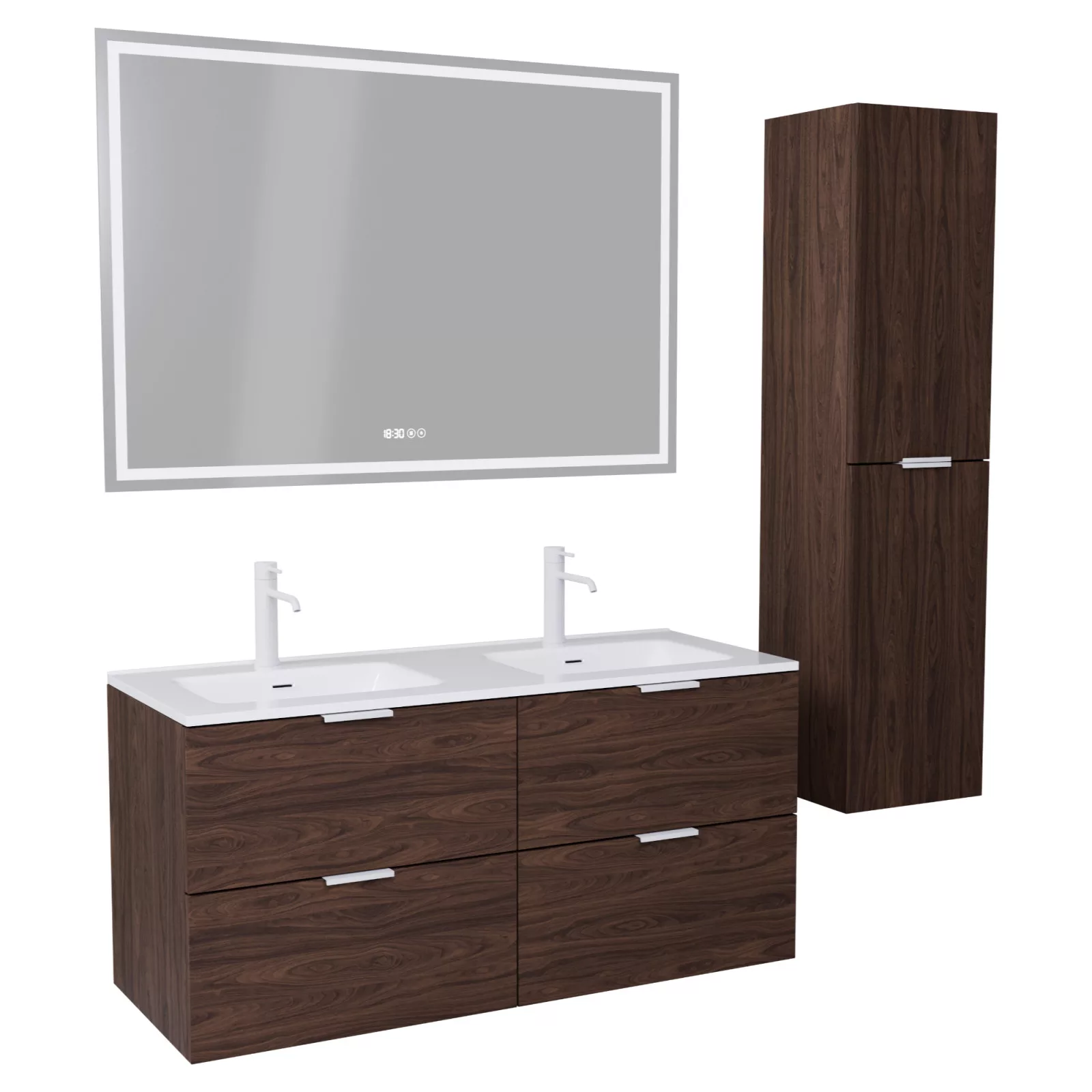 Saját márkás 120 cm széles komplett fürdőszoba bútor fali mosdószekrénnyel mogyoró színben, matt fehér fogantyúkkal, okos LED tükörrel és magasszekrénnyel.